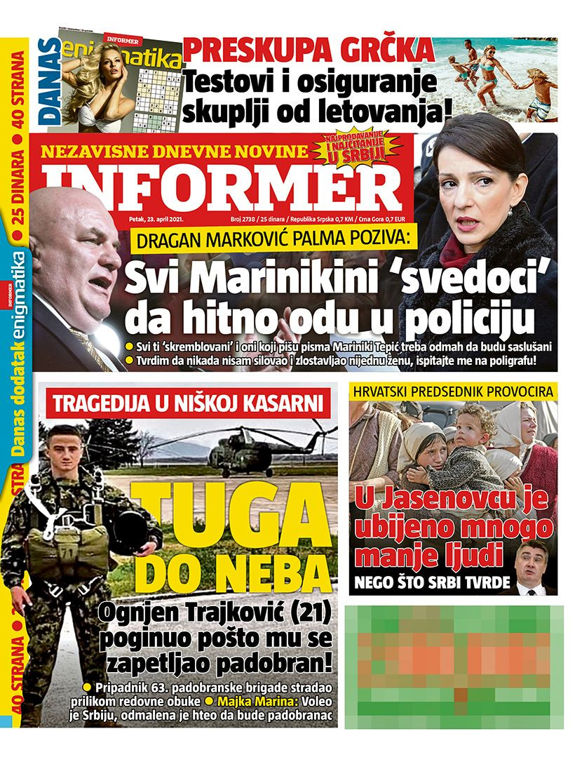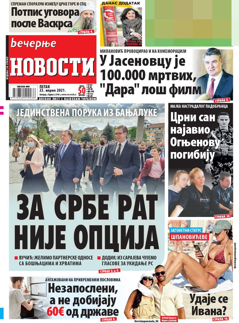 Dnevne novine u Srbiji za petak, 23. april 2021. godine, na naslovnim stranama najavljuju brojne aktuelne društveno-političke teme i donose ekskluzivne priče.