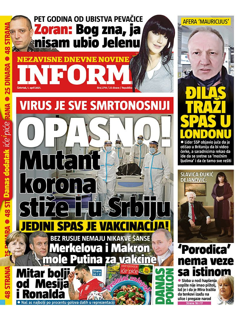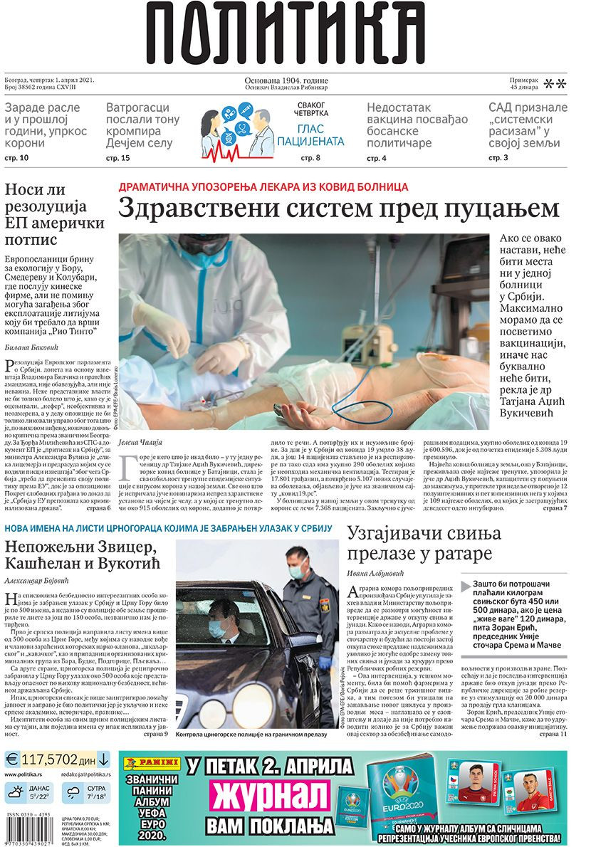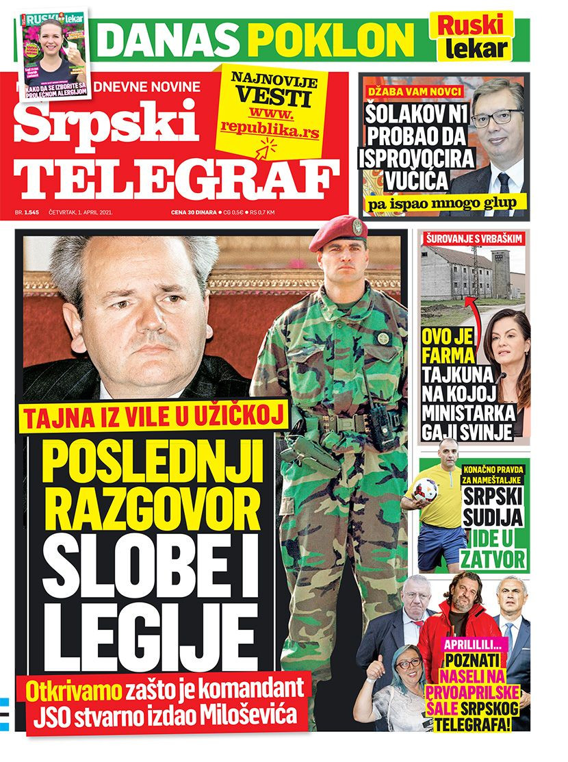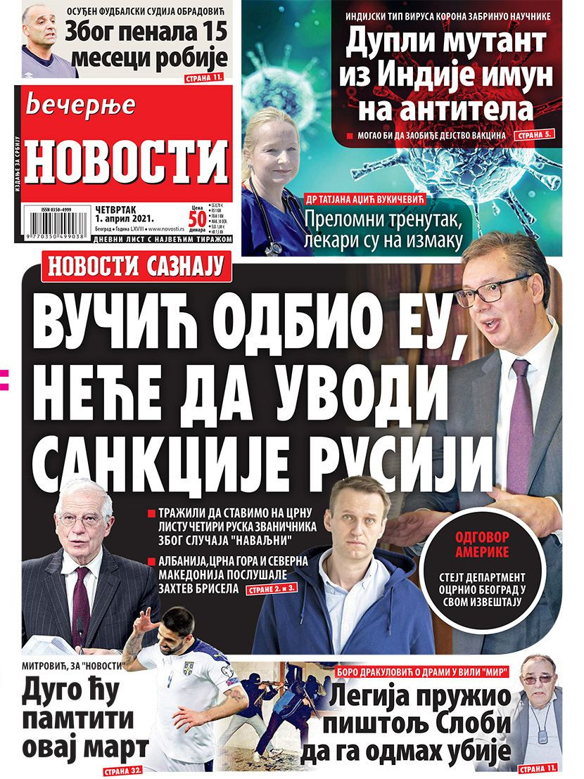 Dnevne novine u Srbiji za četvrtak, 1. april 2021. godine, na naslovnim stranama najavljuju brojne aktuelne društveno-političke teme i donose ekskluzivne priče.