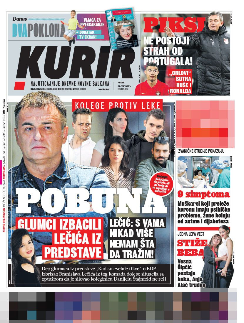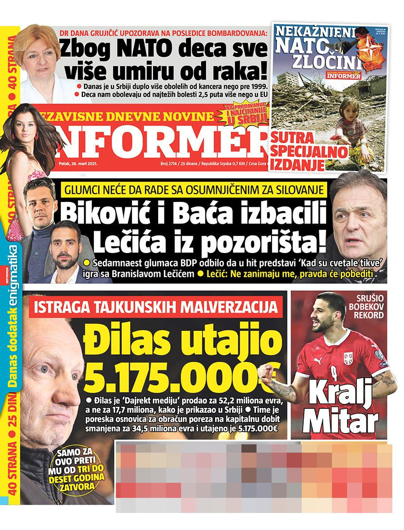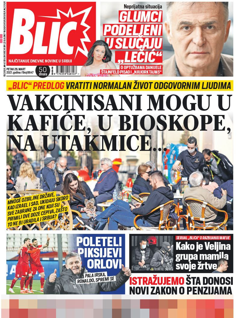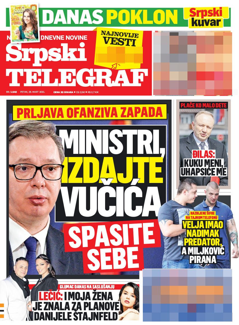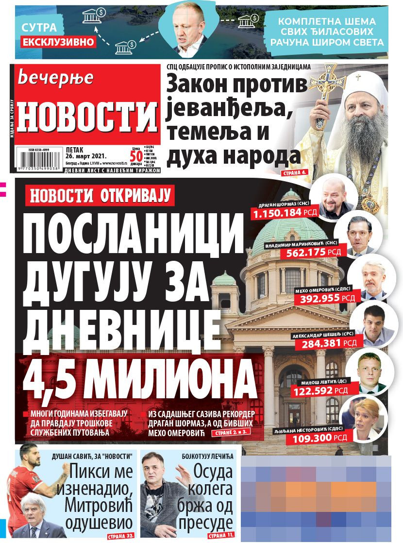 Dnevne novine u Srbiji za petak, 26. mart 2021. godine, na naslovnim stranama najavljuju brojne aktuelne društveno-političke teme i donose ekskluzivne priče.