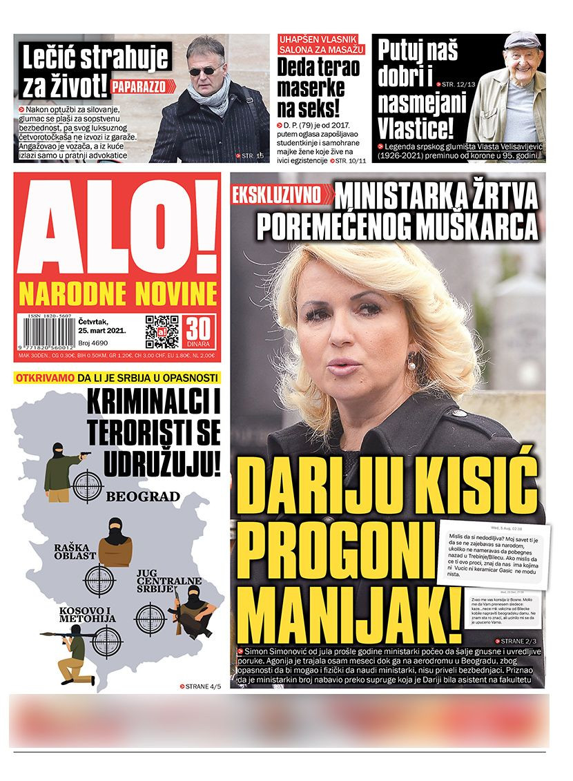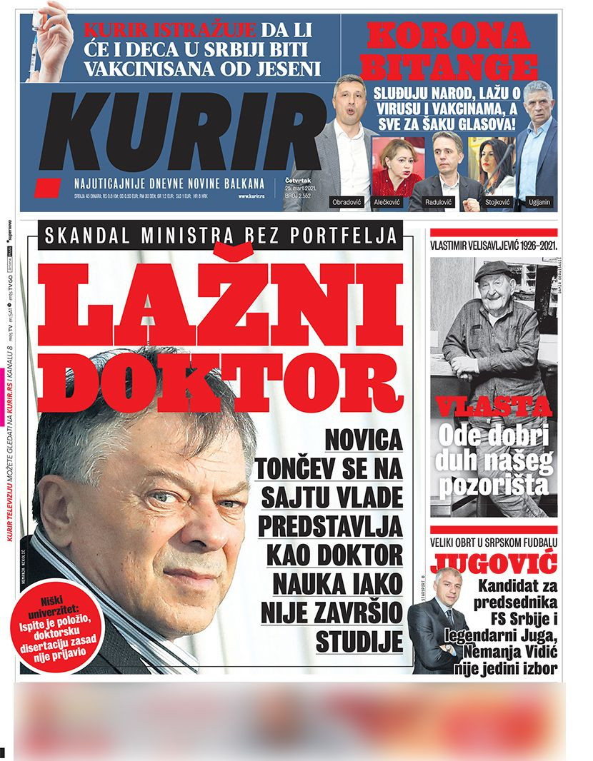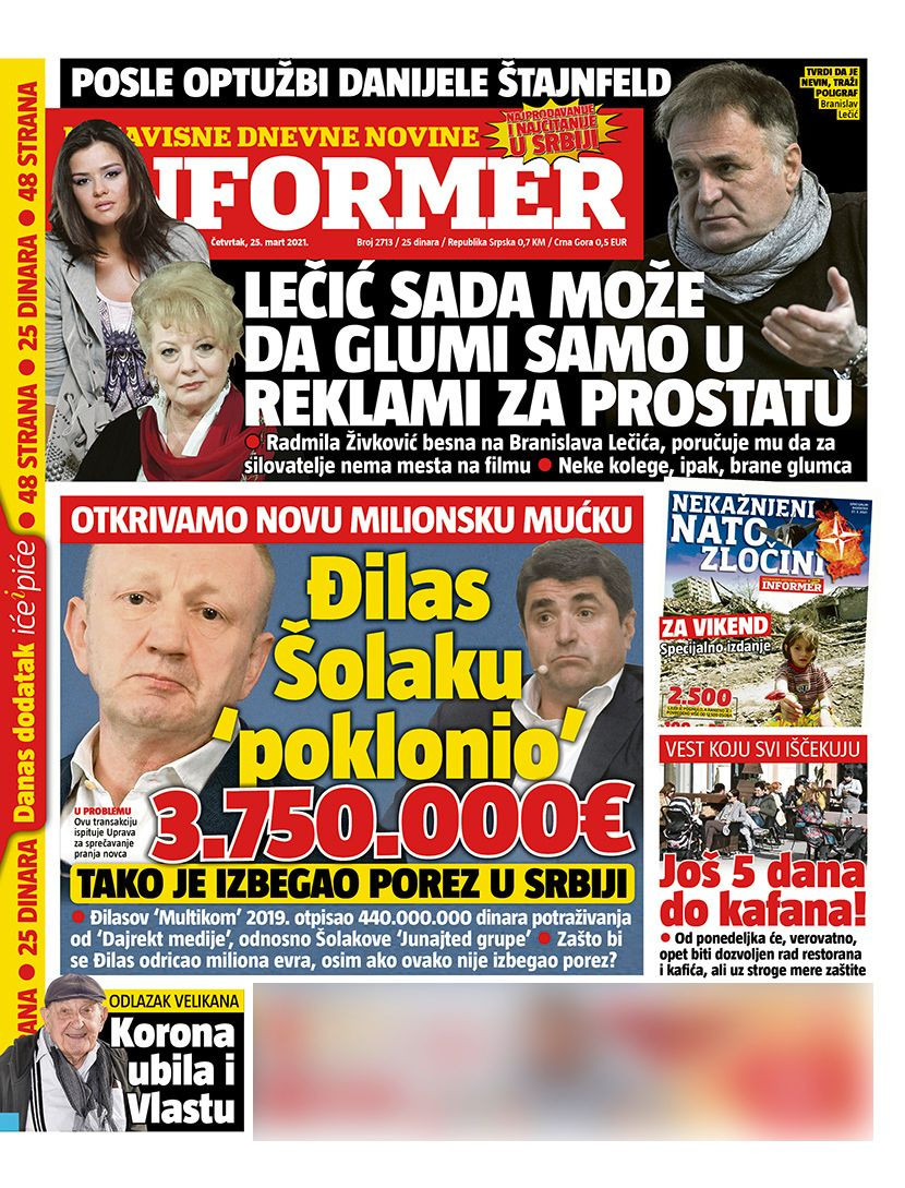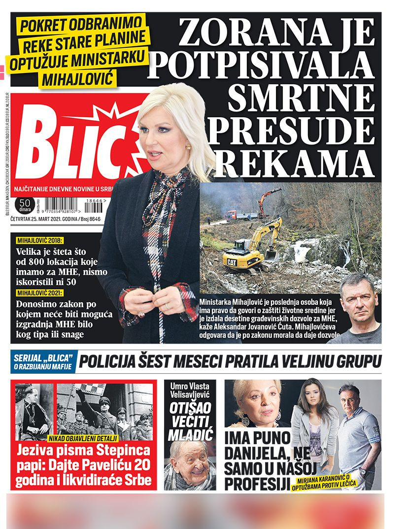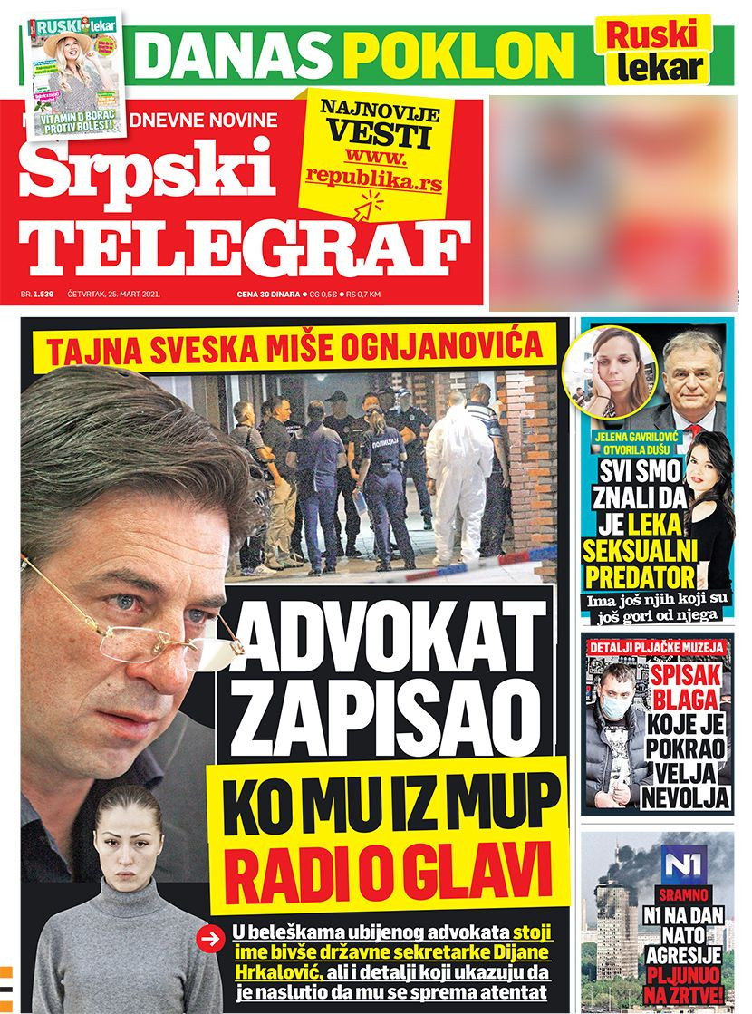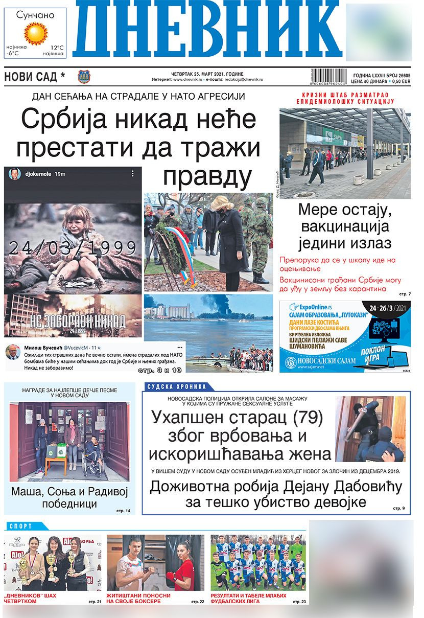 Dnevne novine u Srbiji za četvrtak, 25. mart 2021. godine, na naslovnim stranama najavljuju brojne aktuelne društveno-političke teme i donose ekskluzivne priče.