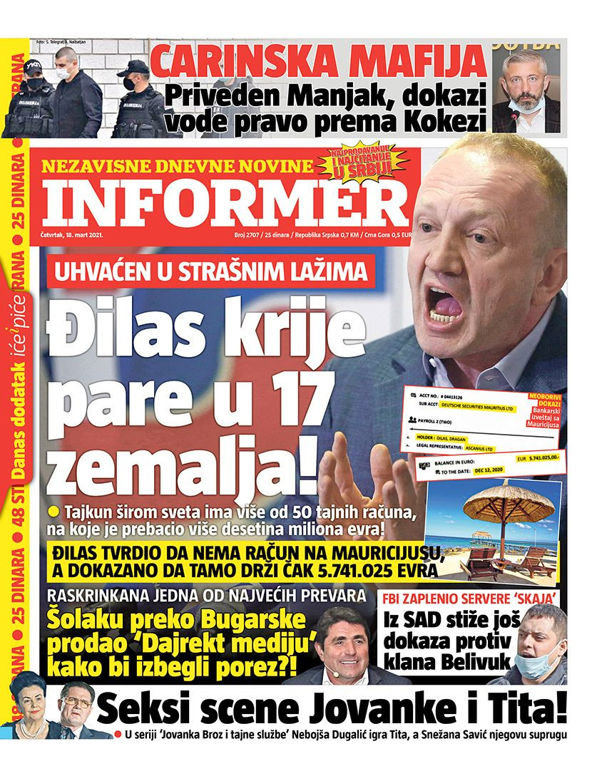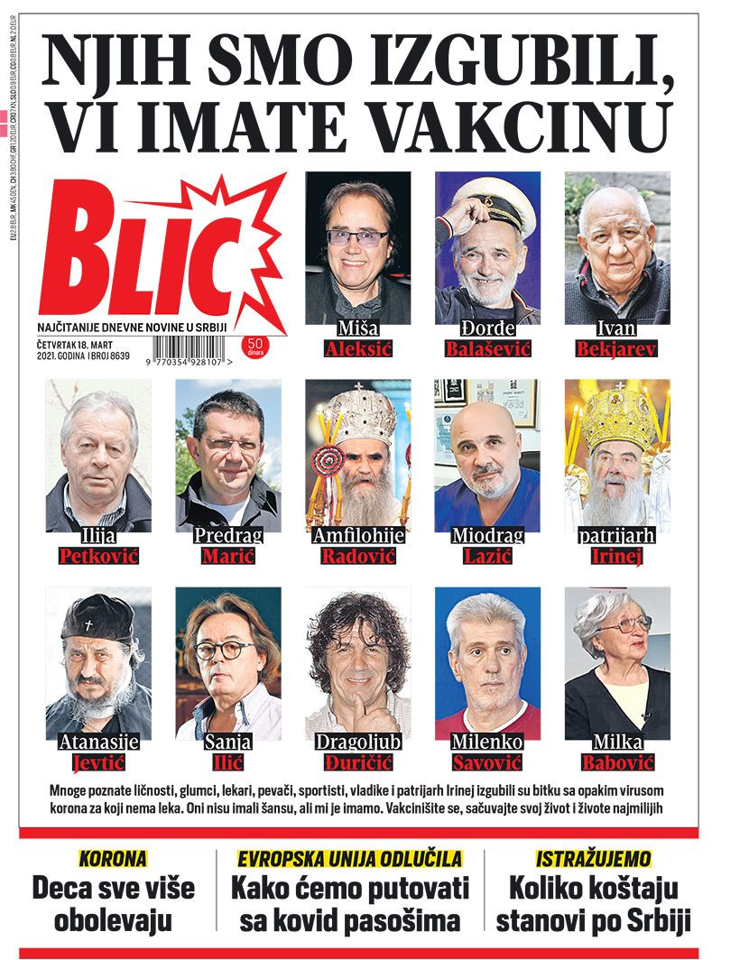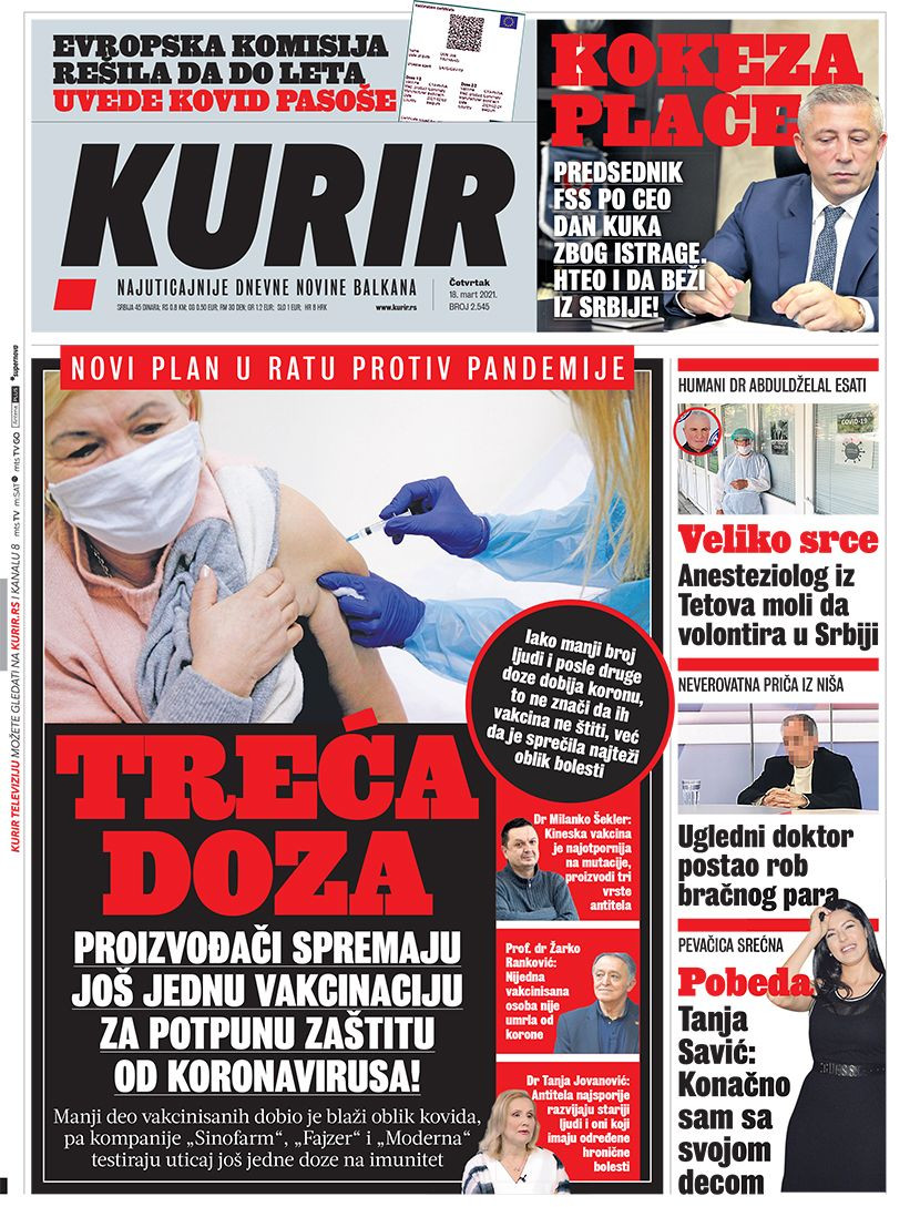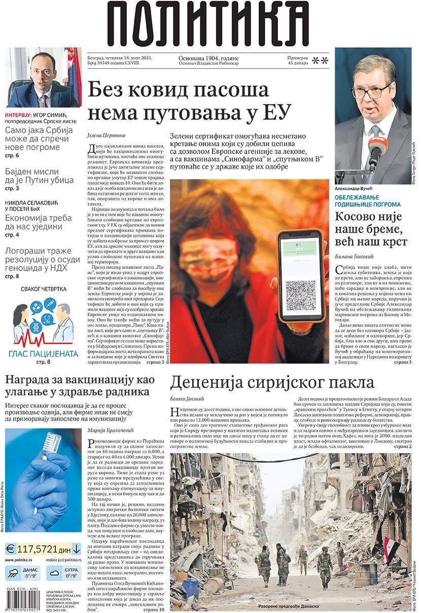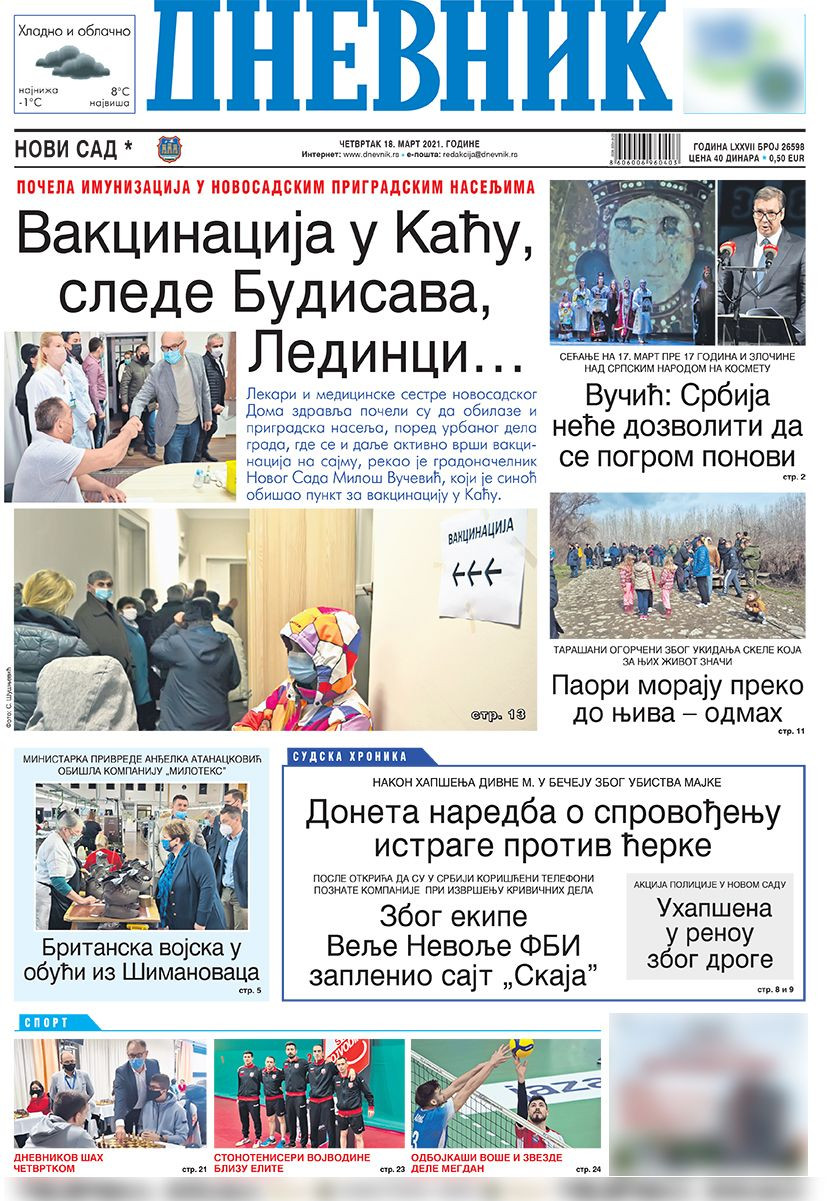 Dnevne novine u Srbiji za četvrtak, 18. mart 2021. godine, na naslovnim stranama najavljuju brojne aktuelne društveno-političke teme i donose ekskluzivne priče.