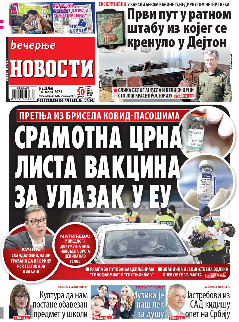Dnevne novine u Srbiji za needelju, 13. mart 2021. godine, na naslovnim stranama najavljuju brojne aktuelne društveno-političke teme i donose ekskluzivne priče.