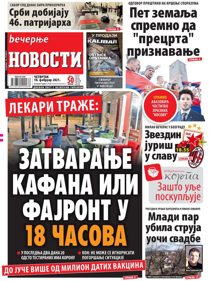 Dnevne novine u Srbiji za četvrtak, 18. februar 2021. godine, na naslovnim stranama najavljuju brojne aktuelne društveno-političke teme i donose ekskluzivne priče.