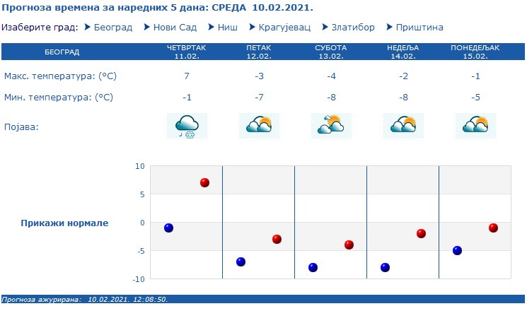 U petak u većini predela suvo, samo još ponegde sa slabim snegom. U subotu suvo sa sunčanim intervalima, a sneg se očekuje samo na jugu Srbije. U nedelju i u ponedeljak na severu i istoku Srbije suvo sa sunčanim intervalima, a u ostalim predelima oblačno, povremeno sa snegom, naročito u južnim i centralnim predelima Srbije. Duvaće pojačan severni vetar.