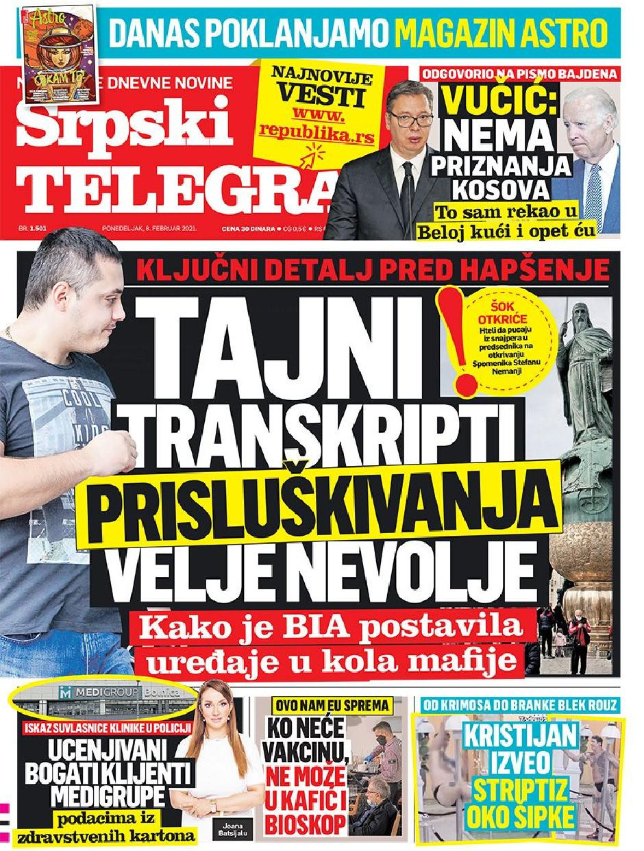 Dnevne novine u Srbiji za subotu, 8. februar 2021. godine, na naslovnim stranama najavljuju brojne aktuelne društveno-političke teme i donose ekskluzivne priče.