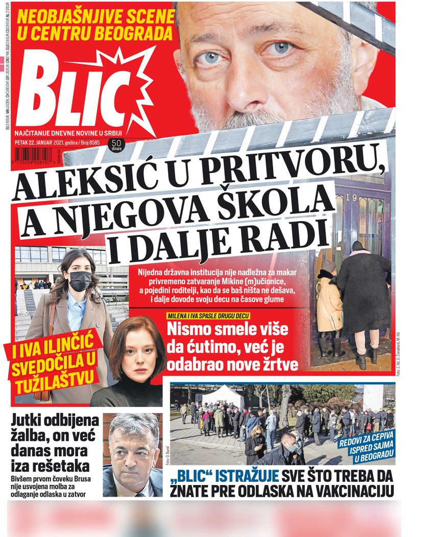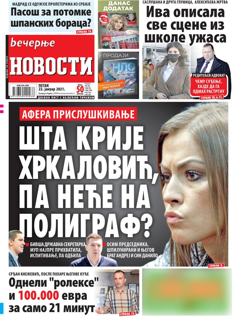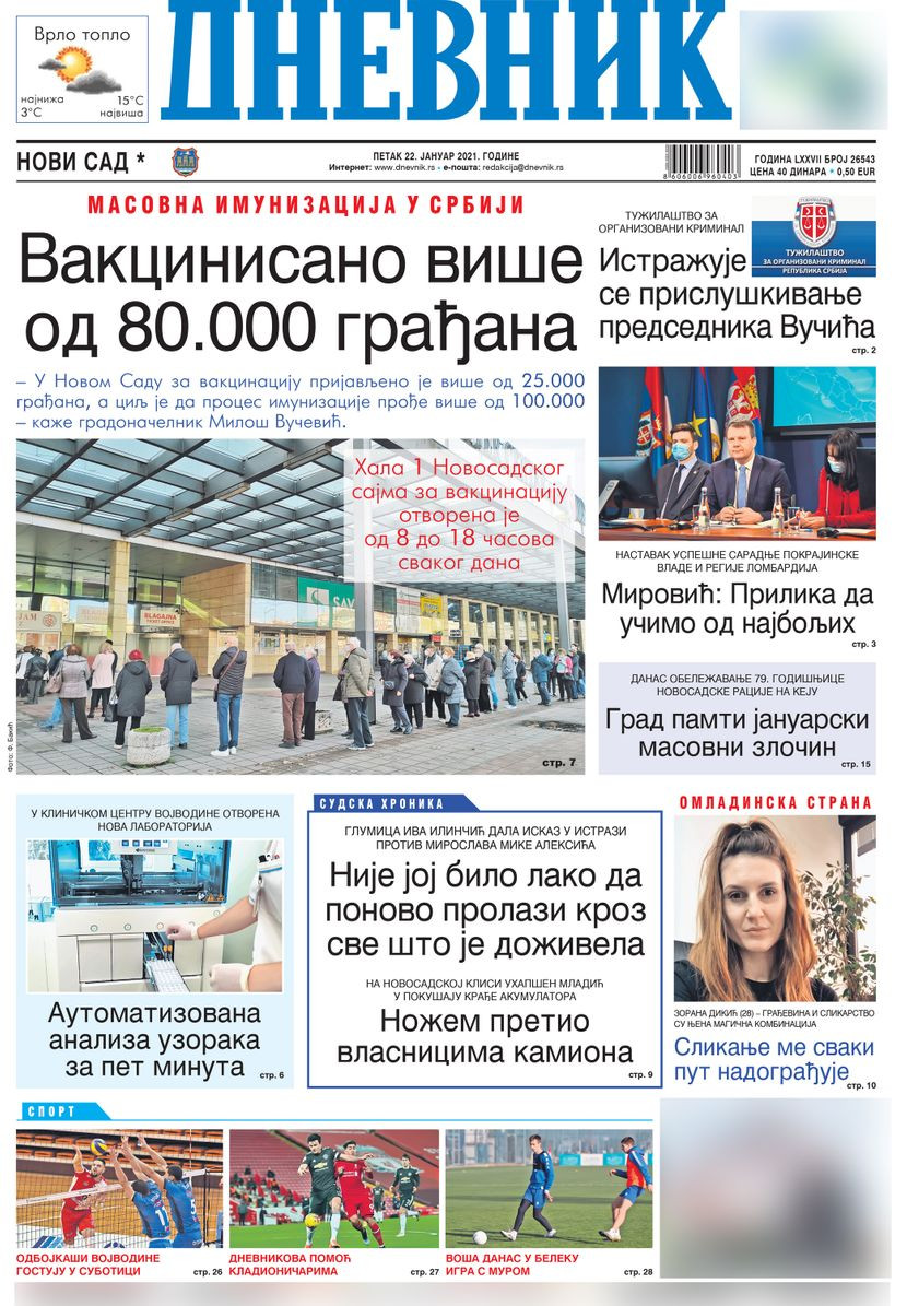 Dnevne novine u Srbiji za petak, 22. januar 2021. godine, na naslovnim stranama najavljuju brojne aktuelne društveno-političke teme i donose ekskluzivne priče.