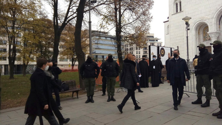 Ispred Hrama Svetog Save prisutne su brojne medijske ekipe, a oko Hrama su raspoređene i jake policijske snage.