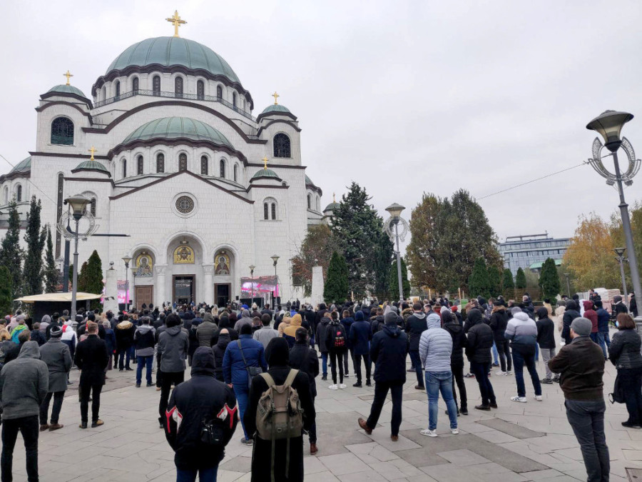 10:41 – Na ulazu u hram Svetog Save stoji čovek koji vernicima deli maske