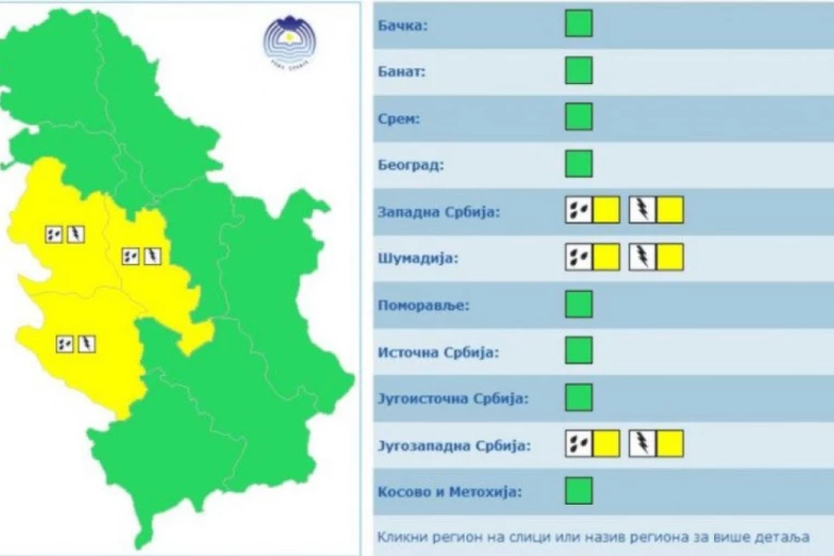 U zapadnoj i jugozapadnoj Srbiji i Šumadiji na snazi je žuti meteoalarm, što znači da vreme može da bude potencijalno opasno. Vremenske pojave koje su prognozirane nisu neuobičajene, ali je potreban oprez ako planirate akrivnosti koje su izložene meteorološkom riziku. Potrebno je da nastavite da se informišete o očekivanim meteorološkim uslovima i da ne preduzimate nepotrebne rizike.