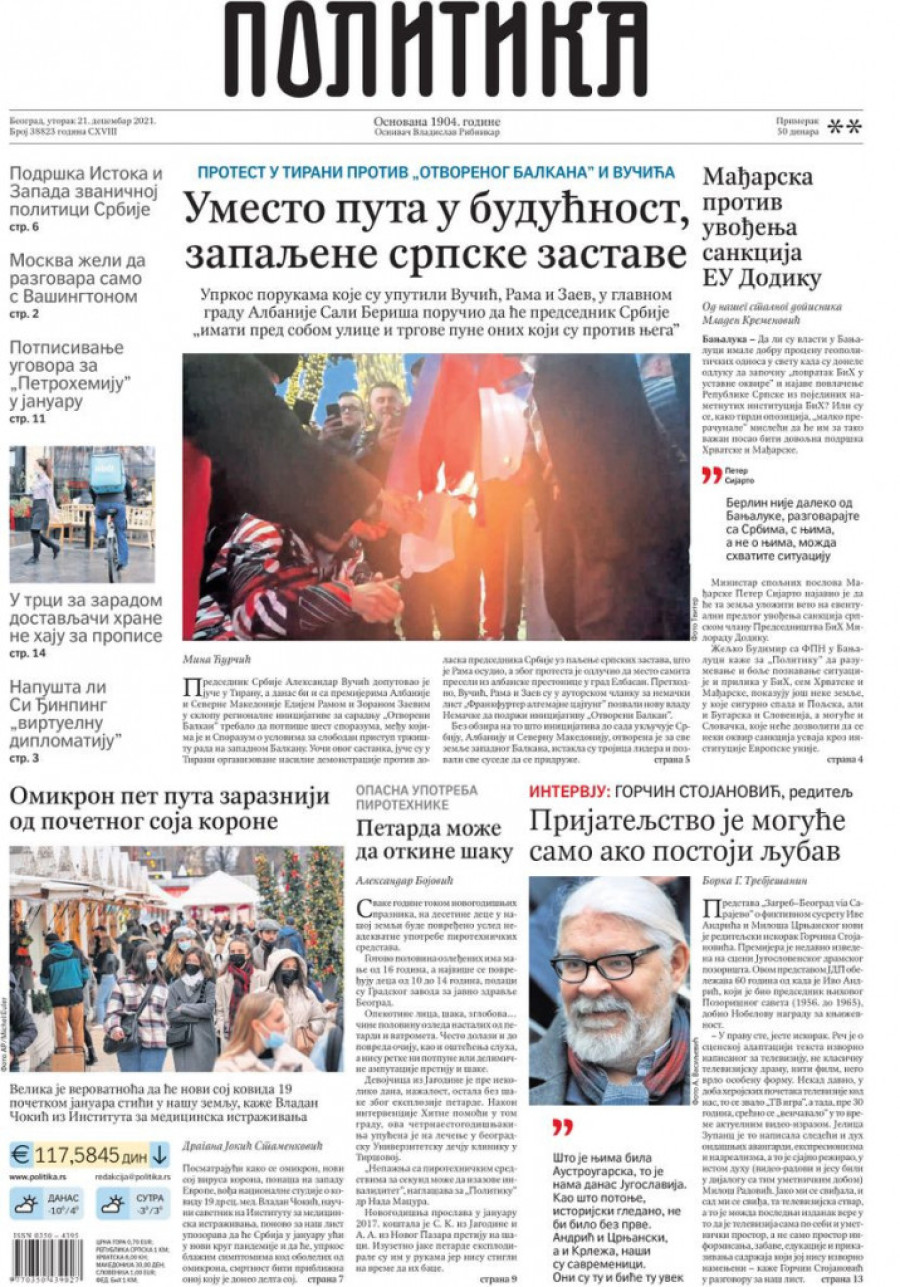 Dnevne novine u Srbiji za utorak, 21. decembar 2021. godine na naslovnim stranama najavljuju brojne aktuelne društveno-političke teme i donose ekskluzivne priče.