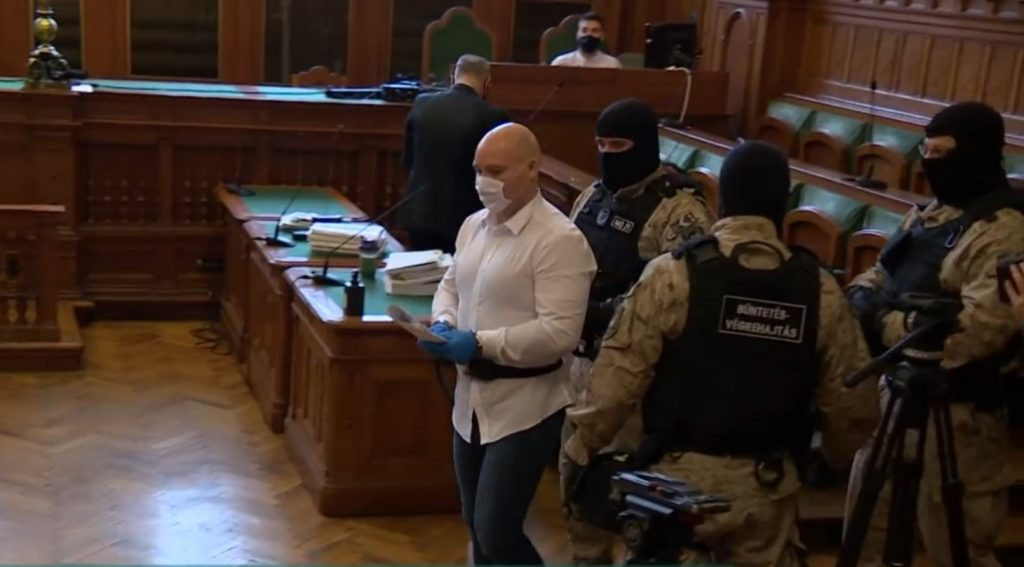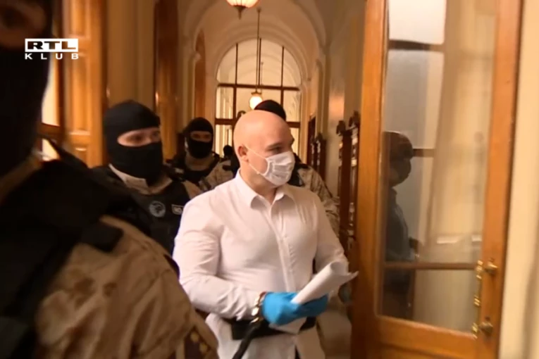 U beloj košulji, sa maskom na licu, rukavicama, ali i lisicama na rukama, Der je u pratnji šestorice stražara doveden u sud u Budimpešti. Njegovo izlaganje trajalo je četiri sata.