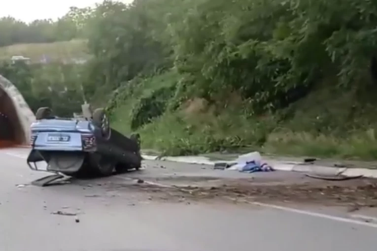 Stravičan udes u Novom Sadu na ulazu u tunel! Automobil na krovu, potpuno uništen, a bandera iščupana 50 metara dalje (VIDEO)