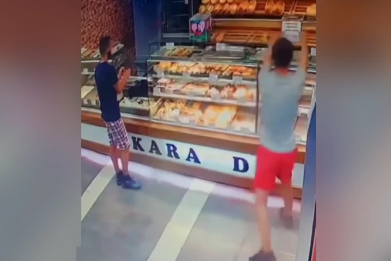 Na pomenutom snimku može se videti da jedan muškarac stoji kod vitirine s pecivima, a potom u pekaru uleće drugi u sivoj majici, uzima kutiju i istrčava.