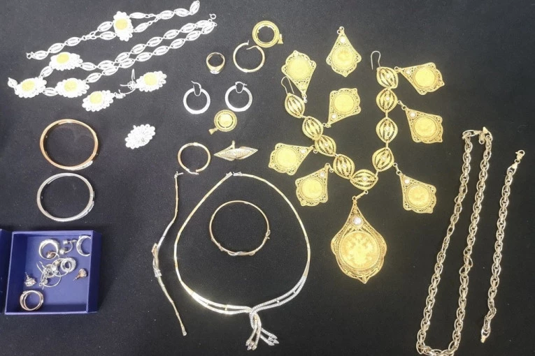 Nakit je bio spakovan u nekoliko kutija i vrećica, a reč je o tri masivne ogrlice, jednom lancu, 6 pari minđuša, 5 narukvica u kombinaciji belog i žutog zlata, kao i četiri prstena sa cirkonima. Procenjena vrednost neprijavljenog zlatnog nakita i satova upitne originalnosti iznosi više od 1. 600. 000 dinara.