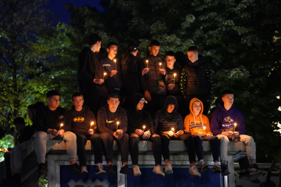 Uplakani učenici, roditelji i nastavnici u suzama, ispred škole odaju počast deci i radniku obezbeđenja koje je jutros hicima iz pištolja ubio dečak K. K. Građani dolaze, pale sveće, ostavljaju cveće i plišane igračke.