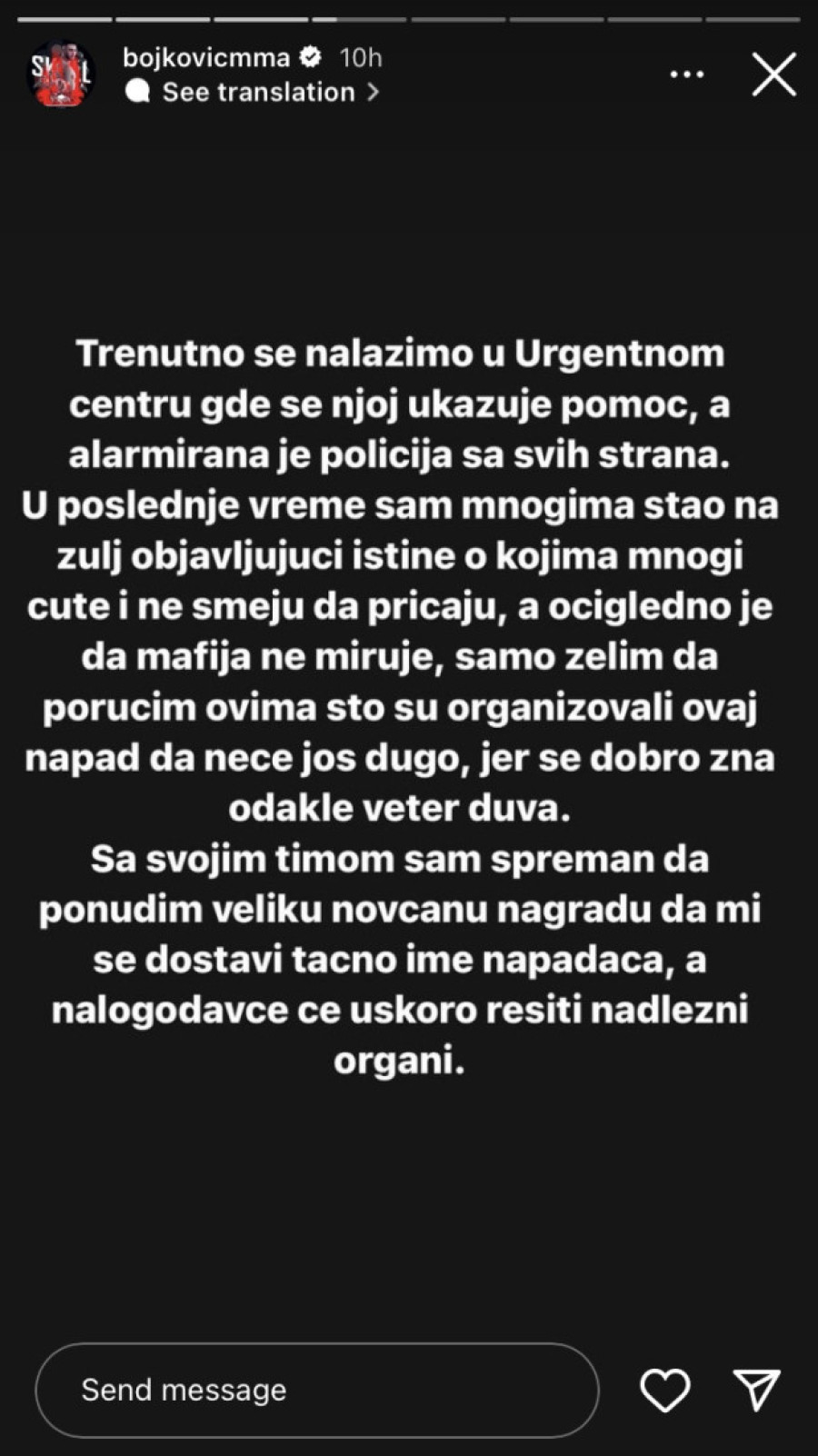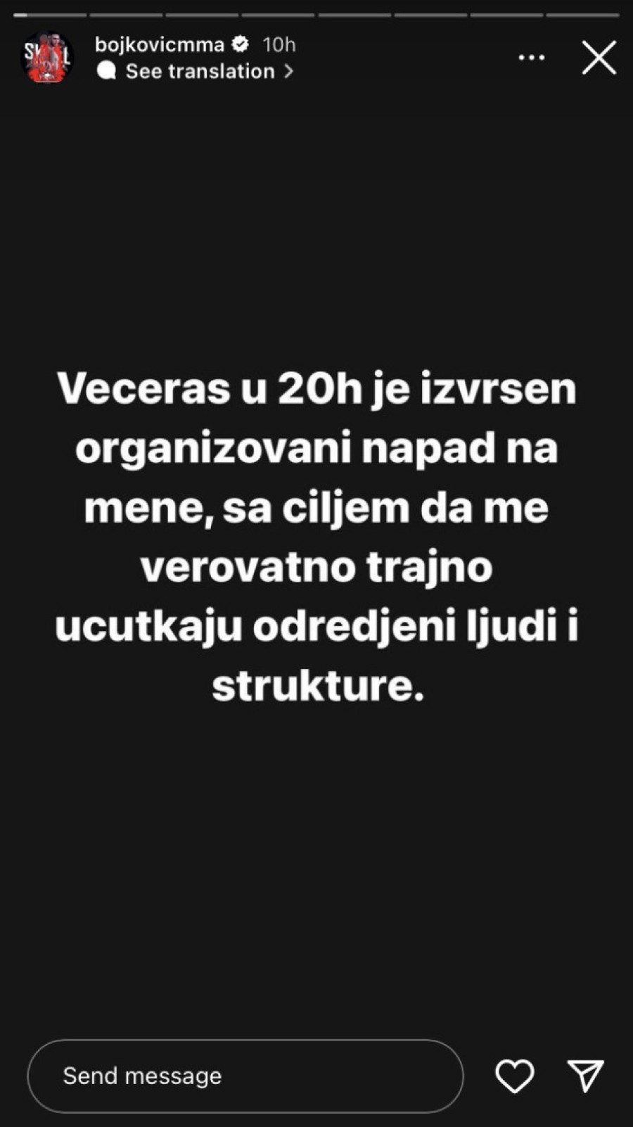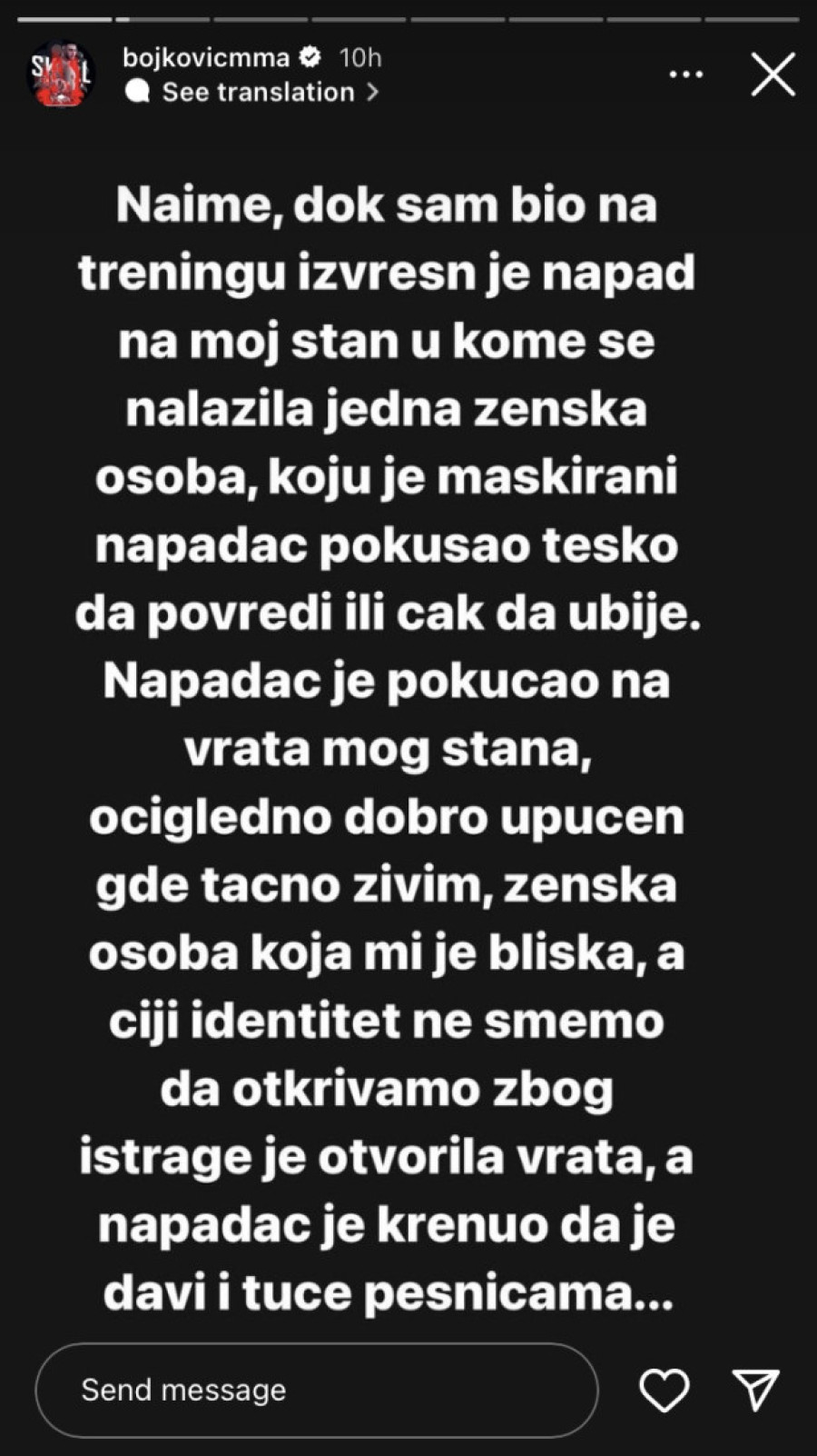 Poznati MMA borac oglasio se na svom Instagramu i objasno šta se dogodilo i izneo je sumnje ko stoji iza napada. Kako je objasnio, sinoć oko 20 sati dok je bio na treningu maskirani napadač je pokucao na vrata njegovog stana u kojem je bila njegova devojka.