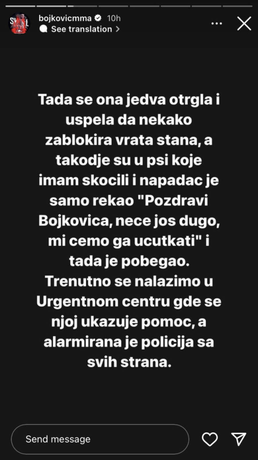 Bojkovićeva devojka je, ne sluteći ništa, otvorila vrata a maskirani je skočio na nju i počeo da je udara. Zgrabio ju je za vrat pokušavajući da je udavi. Devojka je, ipak, ostala prisebna i uspela da se odbrani i izgura napadača. U tome su joj pomogli i psi koje MMA borac ima, a onda je zatvorila vrata i zaključala ih.