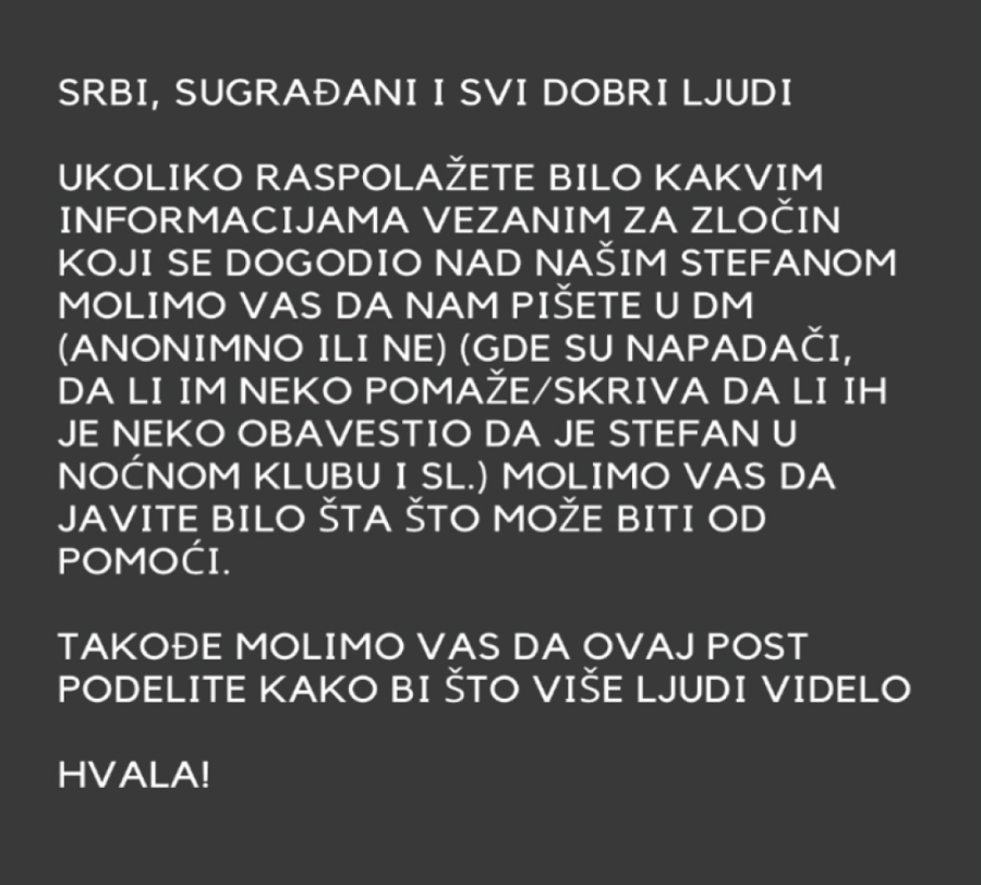 - Osumnjičeni za ubistvo Stefana Savića, još uvek se nalaze na slobodi, za njima je raspisana poternica, međutim, još uvek izmiču pravdi. Prema poslednjim nezvaničnim informacijama, oni su viđeni u regionu, stoga se nadamo da će ih uskoro uhapsiti i da će ih stići kazna - kaže izvor.