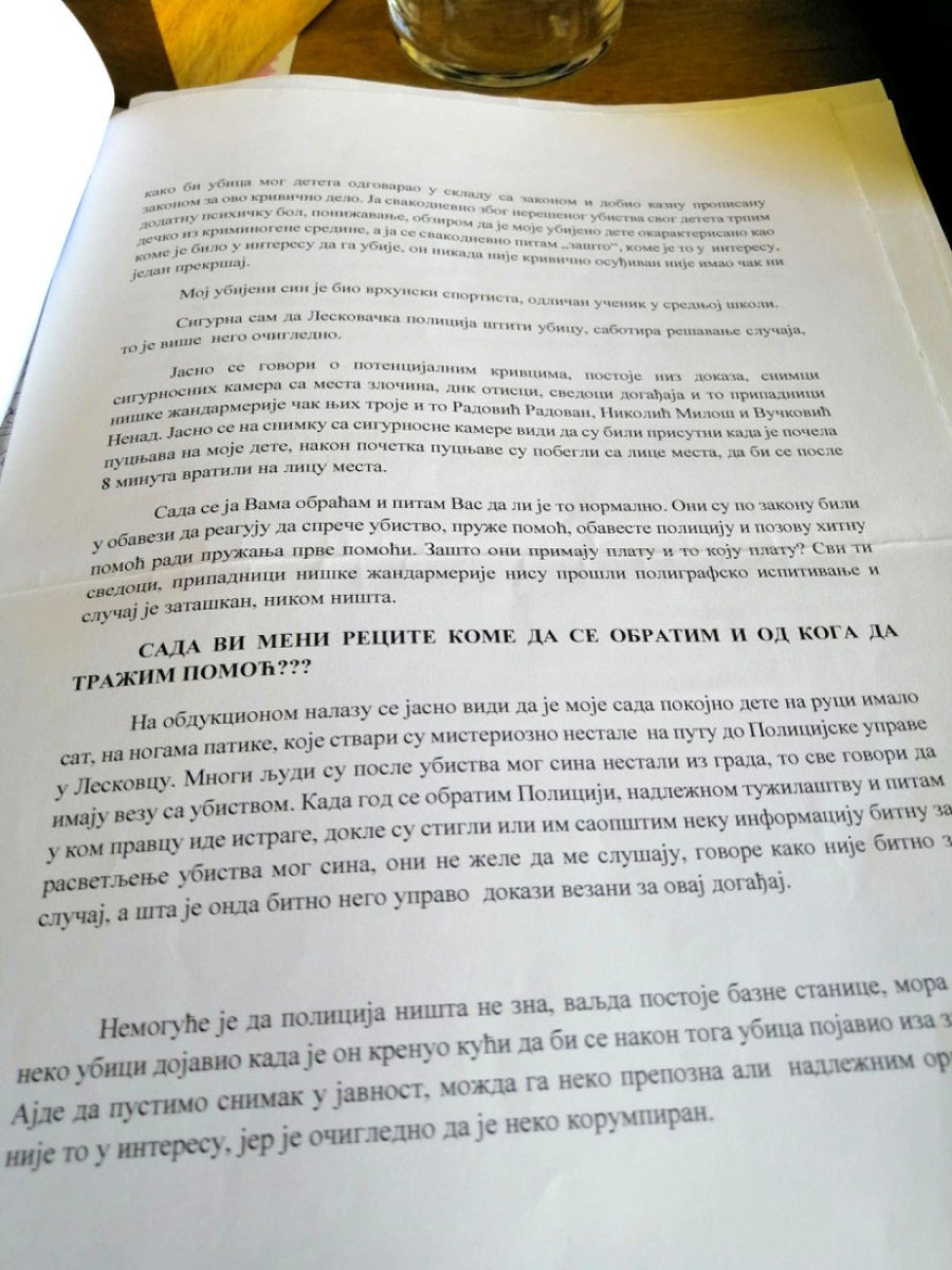 Neutešna majka kaže da se obraća svim institucijama u ovoj zemlji, posebno MUP-u ako je voljan da reši slučaj ubistva njeng deteta, za koji se ona uporno bori šest i po godina i gde postoje svi relevantni dokazi, činjenice, svedoci, snimci, dokaznih materijala, a niko nije raspoložen da to reši.