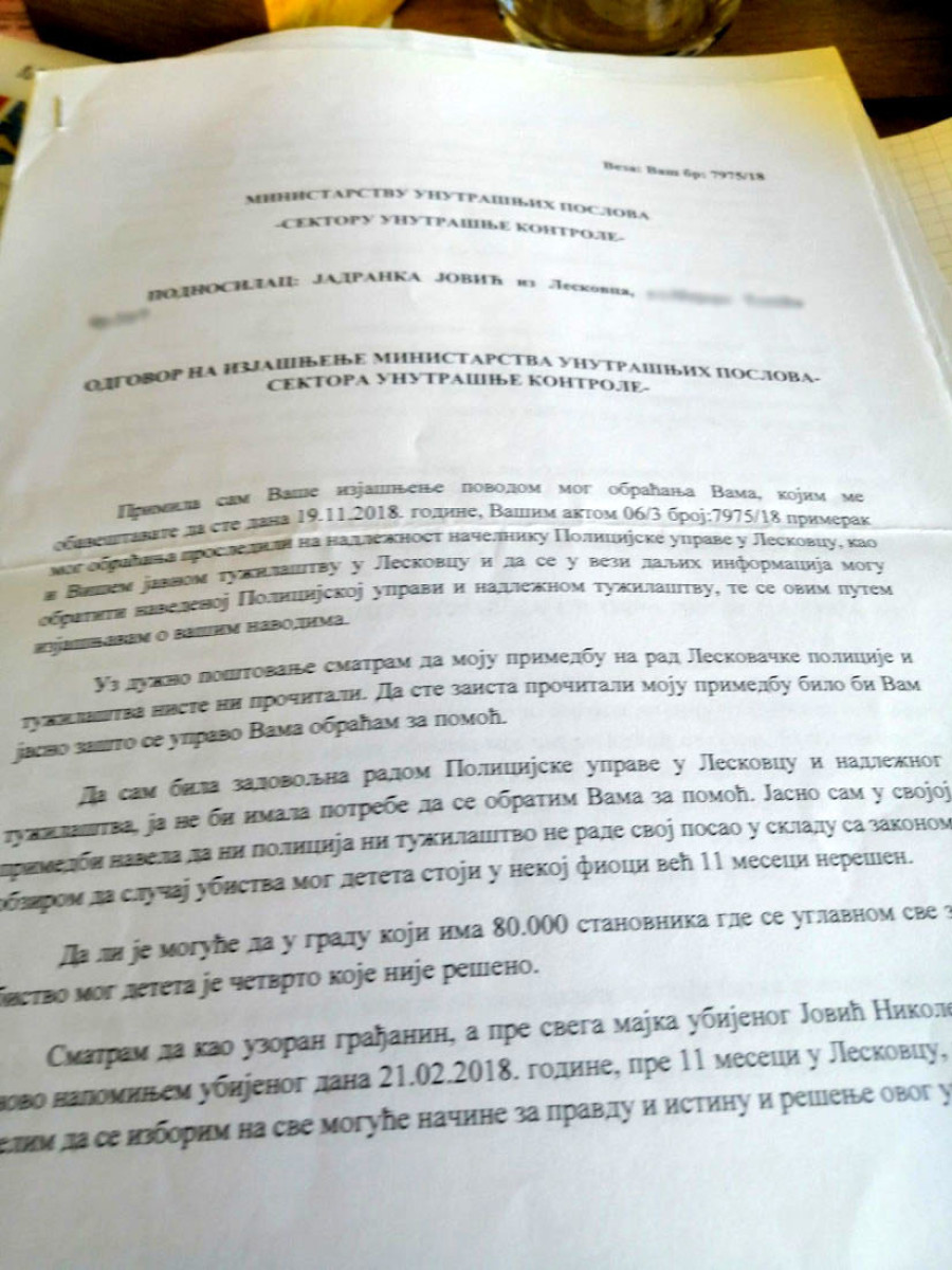 Više puta se, navodi, obraćala MUP-u i uporno tvrdila da se ne radi kako treba, da postoje propusti u radu. Oni, međutim, nisu reagovali. Odgovor je bio da je leskovačka policija uradila sve što je trebalo.