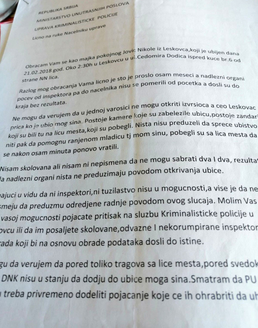 Leskovačka policija, ubeđena sam, zna ko je ubio mog Nikolu. Ne znam da li znaju zašto, ali ko ga je ubio to apsolutno znaju. Prikrivaju se dokazi, predmet se čuva u fioci, gomilaju se papiri, kao nešto se radi, ali se ništa ne dešava. Molim MUP, molim sve institucije ove države, da se angažuju da se ovaj slučaj reši, jer ja sam majka, majka jednog izgubljenog života u 23. godini