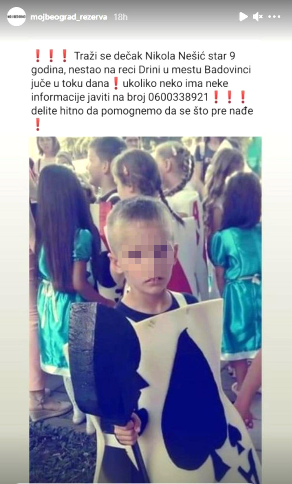 Mirjana P., majka dečaka Nikole N. (9) iz Badovinaca u ispovesti za 24sedam kaže da za njenim sinom traga 120 policajaca već tri dana! Naime, dečak je nestao u sredu, a kako smo saznali, pronađeni su njegova bicikla i kupaće gaće na obali reke Drine. Takođe, ronioci su pretraživali korito reke Drine, ali od deteta ni traga ni glasa još uvek.