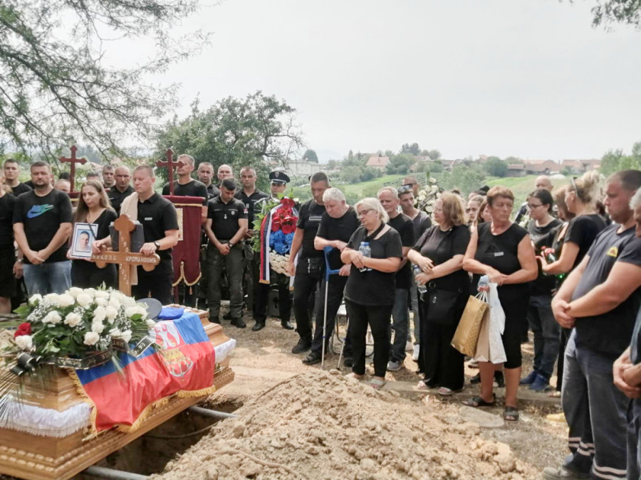Pripadnik MUP-a sahranjen je sa policijskom šapkom i zastavom Srbije, a u sanduk je stavljeno i ćebe. Pre spuštanja u raku pripadnici Žandarmerije su otpevali "Hriste Bože".