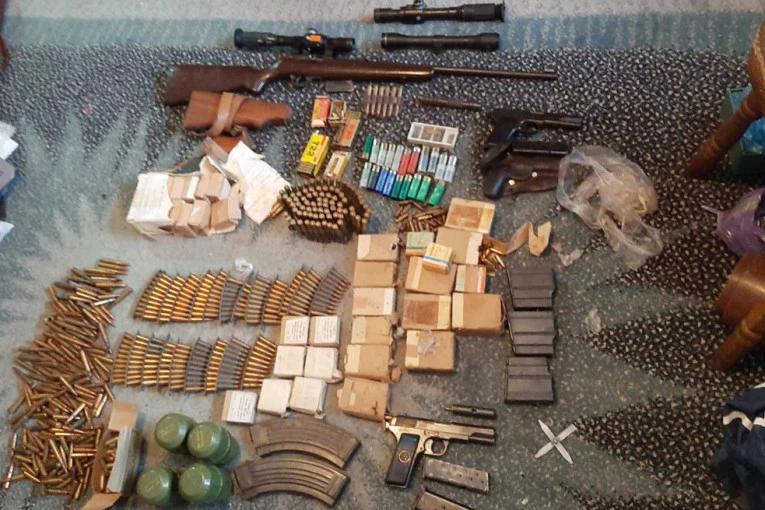 Policija je prilikom pretresa stana i drugih prostorija osumnjičenog pronašla četiri ručne bombe, dva pištolja, malokalibarsku pušku, pet različitih okvira, 1.568 komada puščane i pištoljske municije različitog kalibra i 20 lovačkih patrona.