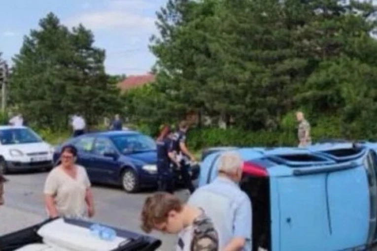 Od siline udara jedno vozilo se prevrnulo na stranu i tom prilikom je povređena jedna osoba.