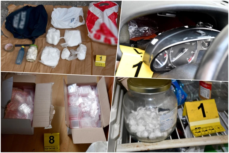 Pregledom automobila "pežo" kojim je vozio A. M. i "citroena" na parkingu ispred stana u kojem su zatečeni osumnjičeni, pronađeno je i zaplenjeno oko šest kilograma amfetamina, oko 10 grama MDMA i 30 tableta ekstazija.