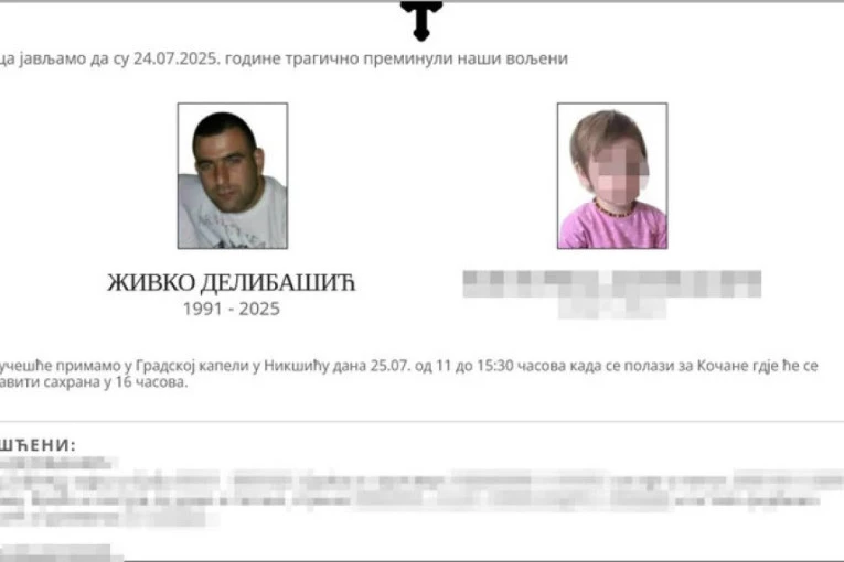 - Tužnog srca javljamo da su 24.jula 2025.godine tragično preminuli naši voljeni. Saučešće primamo u Gradskoj kapeli u Nikšiću 25.jula od 11 do 15.30 časova kada se polazi za Kočane gde će se obaviti sahrana u 16 časova - piše na čitulji uz potpis porodice Delibašić.
