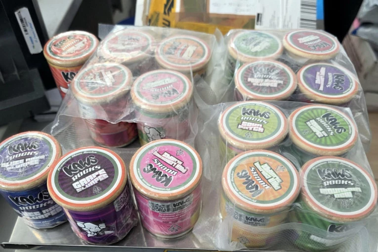 Kako je saopšteno, u pošiljci pronađenoj početkom avgusta, nalazilo se 16 staklenih teglica sa natpisom ''Kaws Rock Grade Slurpee'' ispunjenih sasušenom biljnom materijom, koja je priručnom analizom odreagovala na marihuanu.
