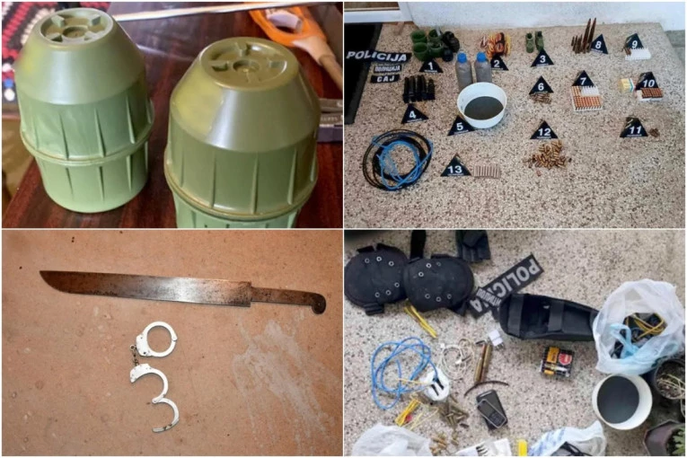 Oduzete su dve ručne bombe, dve kutiјe za ručne bombe, јedna mačeta, 5 pištoljskih okvira, preko 200 komada pištoljske i puščane municiјe različitog kalibra,10 komada čaura, elektronske kapisle, dva mobilna telefona, tri policiјske oznake, službena legitimaciјa MUP-a, dva para službenih lisica, јedna gas maska, beretka sa srpskim grbom i više komada voјne garderobe.