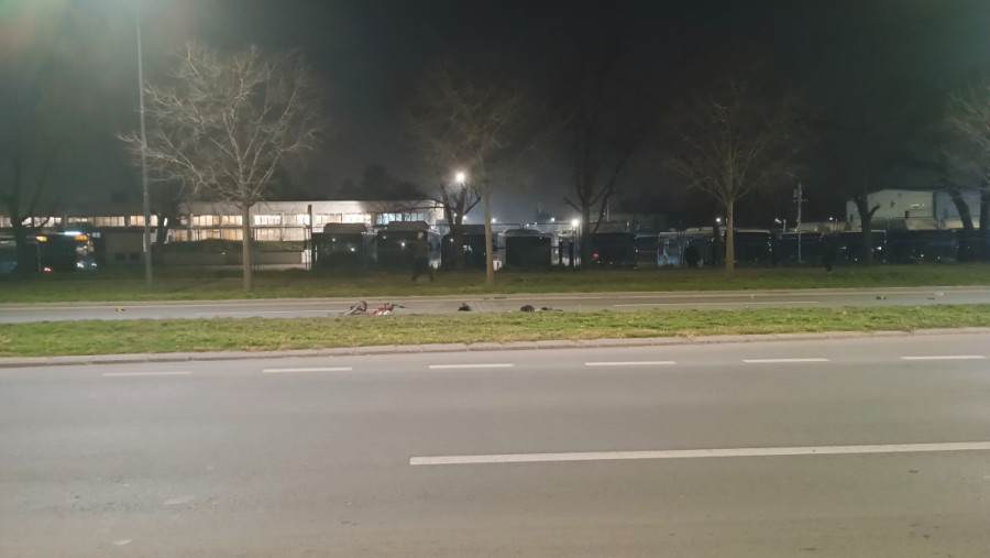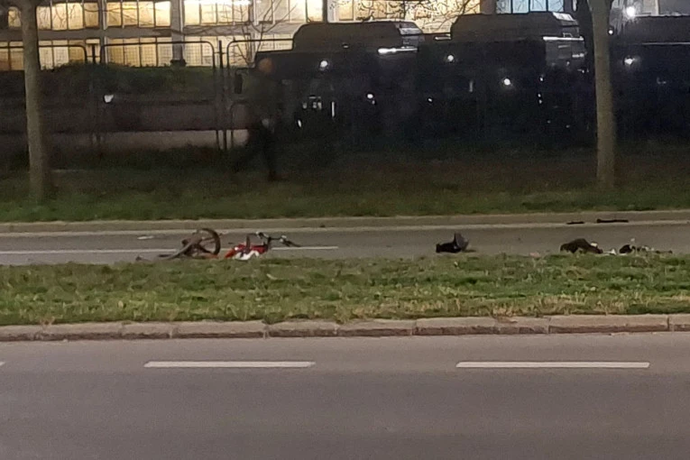 Prostor gde se nezgoda dogodila ograđen je i na putu su još motor kao i delovi bicikla koji su razbacani na sve četiri kolovozne trake i na trotoaru.
