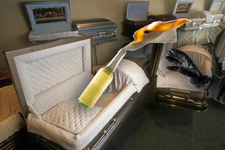 Nepoznata osoba je razbila izlog i ubacila Molotovljev koktel u objekat, ali ona nije eksplodirala već je samo gorela na mestu gde je pala, zahvativši deo unutrašnjosti i oštetivši nekoliko kovčega.
