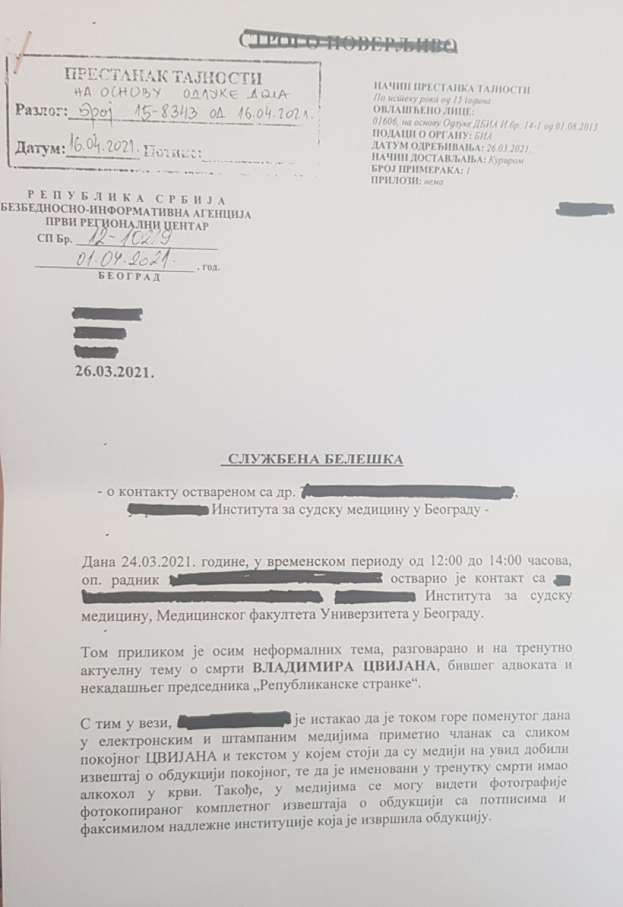 Podsetimo, Bezbednosna informativna agencija objavila je danas dokumenta o uzrocima smrti advokata Vladimira Cvijana, bivšeg pravnog savetnika i generalnog sekretara predsednika Borisa Tadića, a potom člana predsedništva SNS. Cvijan je preminuo 5. januara 2018. godine, a kao uzrok smrti navedeno je utapanje u Dunavu. O njegovoj smrti javnost nije bila upoznata sve do pre nekoliko meseci.