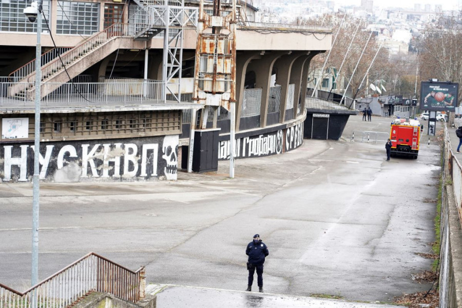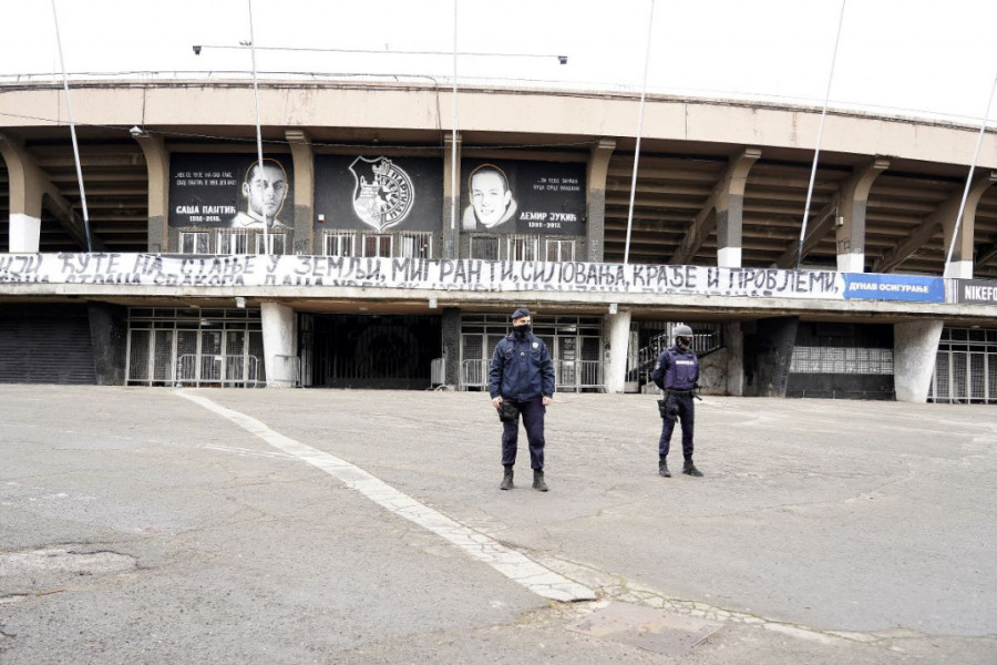 Stadione je policija opkolila s velikim brojev vozila, a na ulici su specijalci pod maskama i sa dugim cevima.