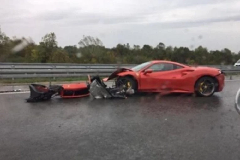 Prednji deo ferarija potpuno je uništen, branik i ostali delovi vozila rasuti su po putu oko automobila