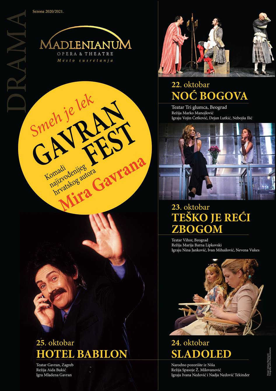 Srbija je peta zemlja na svetu u kojoj se održava festival ovog veoma plodnog hrvatskog autora, čiji su komadi doživeli 350 premijera širom planete. Ovo je prvi festival u Srbiji, a već 11. po redu, a ovde je pokrenut na inicijativu direktorke „Gavran festa“ Madlene Zepter, vlasnice i osnivača Madlenianuma. Pored dva ansambla iz Beograda, na programu smotre u subotu je i duo komedija “Sladoled”, Narodnog pozorišta iz Niša, a za sam kraj festivala, u nedelju, biće premijerno gostovanje monokomedije “Hotel Babilon” Gavran teatra iz Zagreba, u kojoj 11 likova igra supruga pisca Mladena Gavran, inače i upravnik Teatra Gavran.
