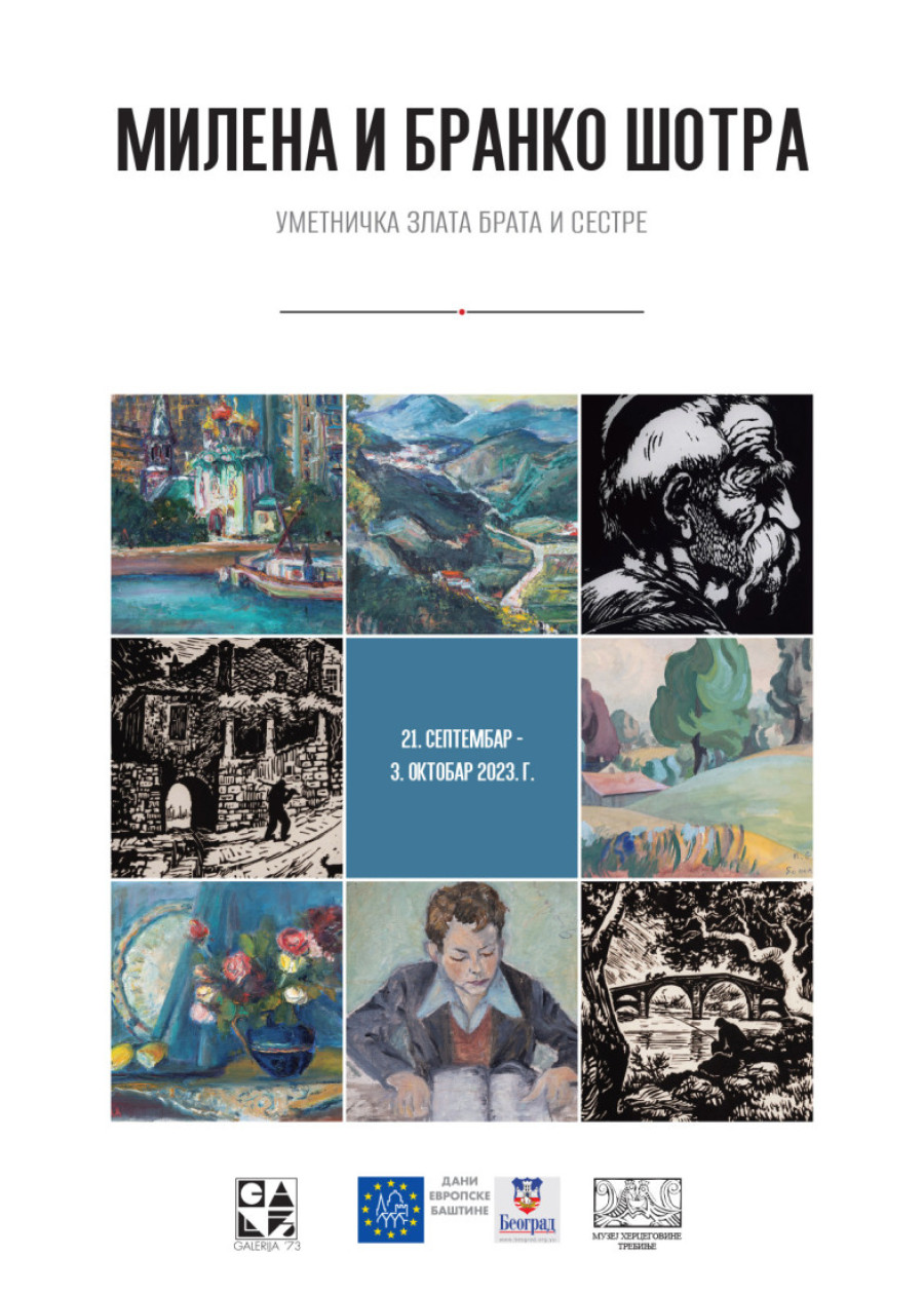 U četvrtak, 21. septembra, sa početkom u 19 časova, u Galeriji `73 biće svečano otvorena izložba slika i grafika Milene i Branka Šotre „Umetnička blaga brata i sestre“, koju čine dela iz zbirke Muzeja Hercegovine u Trebinju, po izboru Đorđa Kadijevića, istoričara umetnosti. Izložba se realizuje u saradnji sa Muzejom Hercegovine u Trebinju, u okviru manifestacije „Dani evropske baštine“.