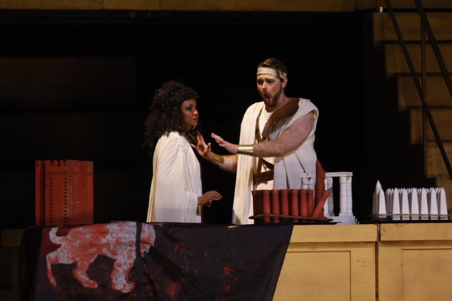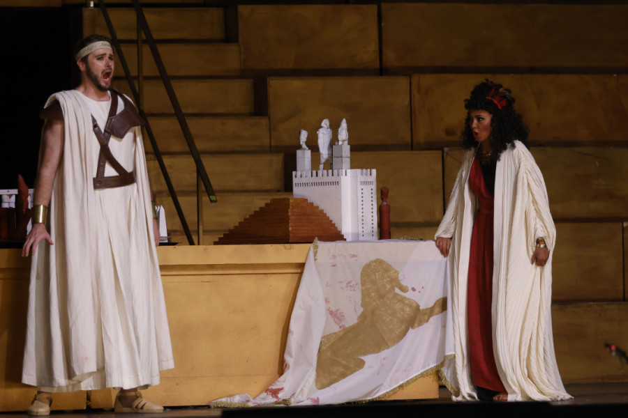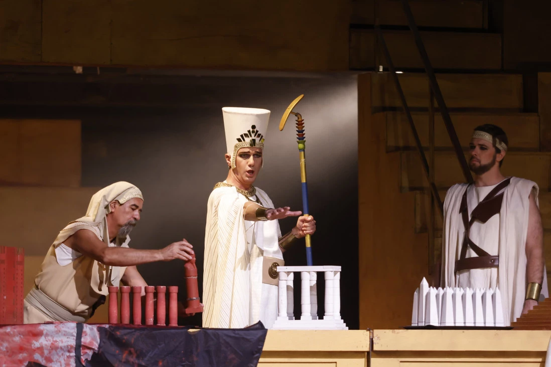 Višnja Radosav (mecosopran) solistkinja Opere SNP-a tumači Amneris, baritonima Željku R. Andriću i Nebojši Babiću poverene su uloge Amonazra i egipatskog kralja, dok je vrhovnog sveštenika Ramfisa na sceni oživeo Goran Krneta.