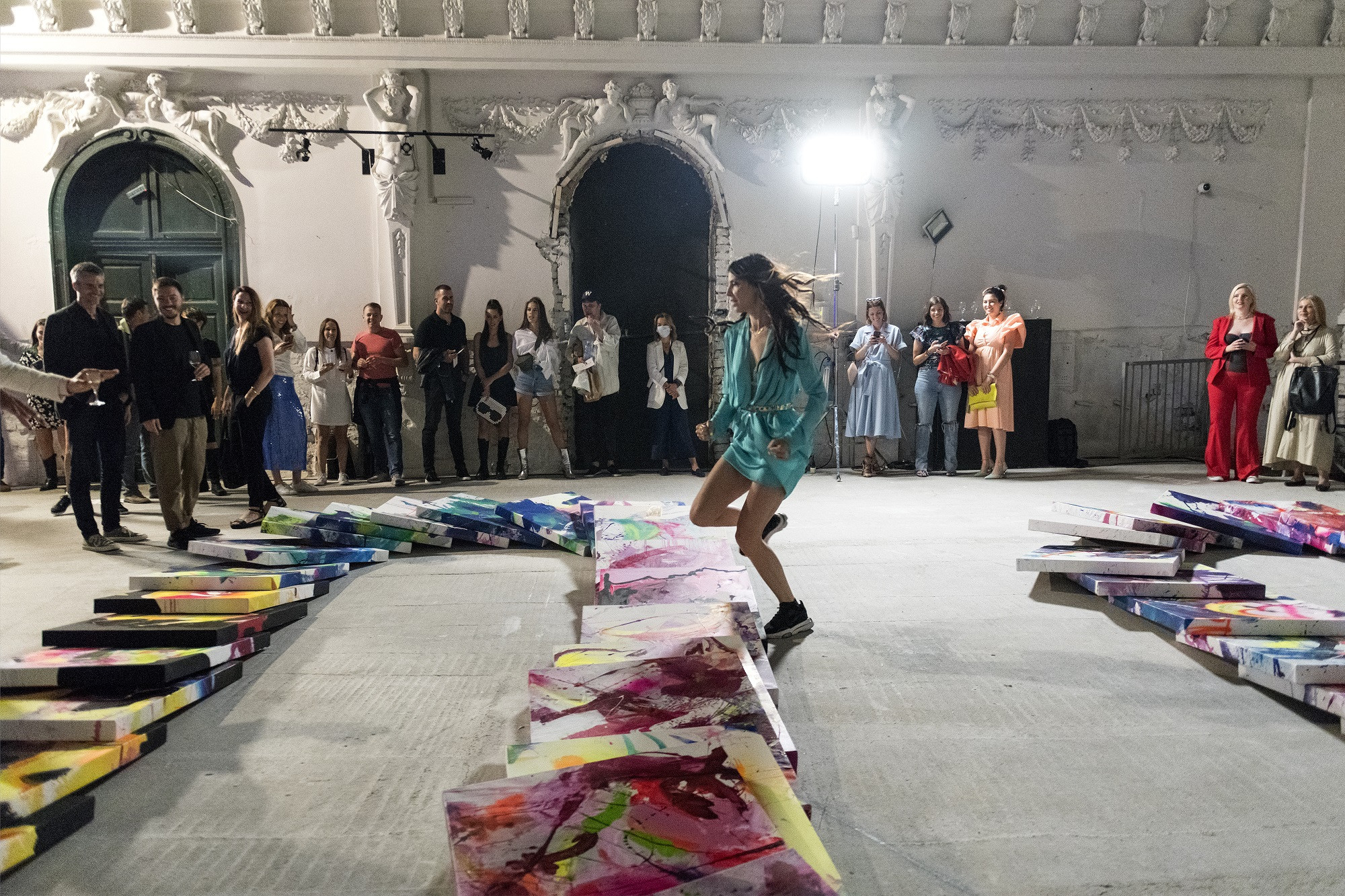 Umetnica je za performans iskoristila 100 svojih slika, istog formata, kako bi publiku uvela u doživljaj trenutka.