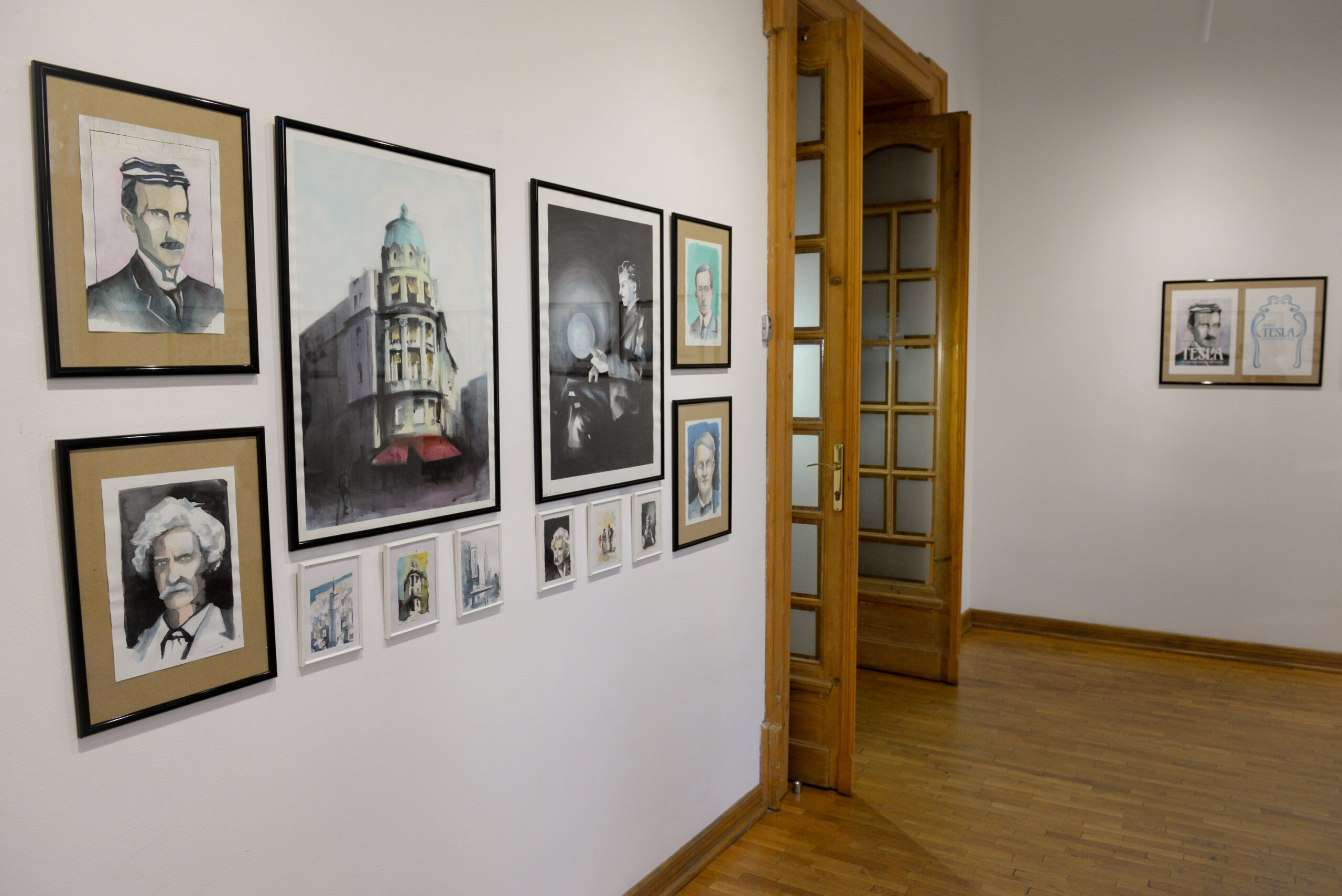 Izloženo je oko 50 radova u akvarel tehnici koji su posvećeni velikom srpskom naučniku i njegovom nesvakidašnjem životu, a koji su nastali kao rezultat Meučijevog rada na prvoj grafičkoj noveli o Tesli.