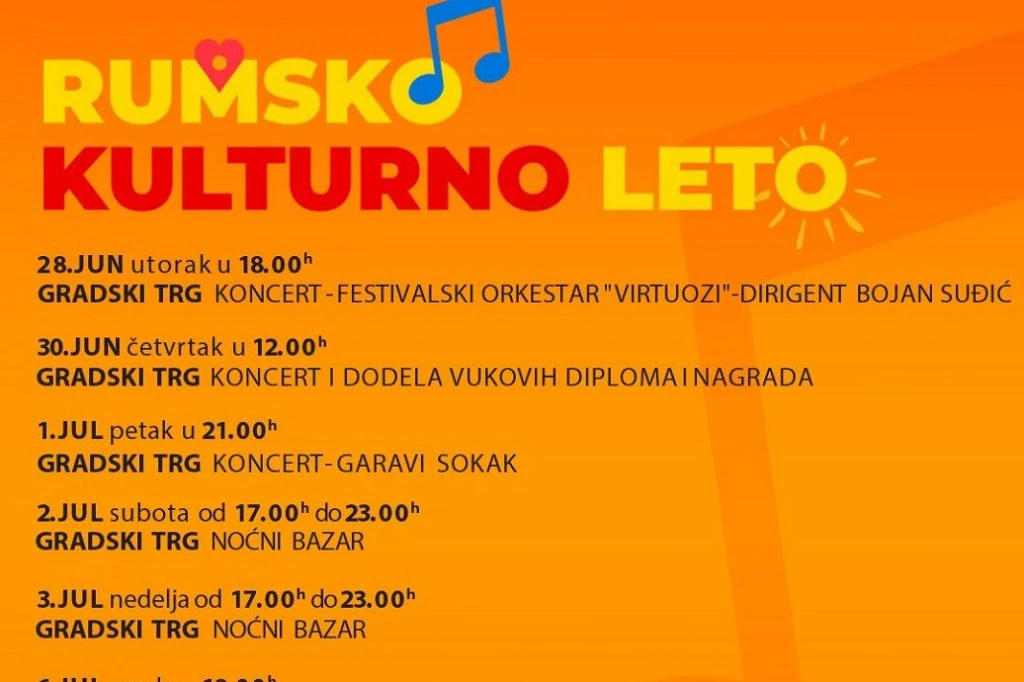 Tradicionalna manifestacija "Rumsko kulturno leto" imaće ove godine veoma bogat i sadržajan program. Počevši od 28. juna do 31. avgusta, publika će imati priliku da poseti brojne koncertne, pozorišne, likovne i književne programe koje su spremile naše ustanove kulture. Programi su raznovrsni na veliku radost Rumljana i svih naših posetilaca, te očekujemo veliku posećenost.