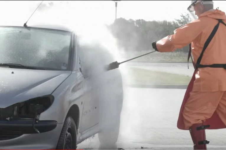 Mašina proizvodi pritisak od 3.000 bara i “cepa” “pežo” 206, kao da ga rešetaju mecima! Koliko je situacija rizična pokazuje i to da osoba koja pere automobil nosi zaštitnu opremu i masku.