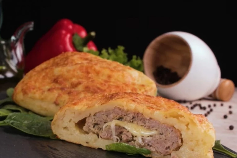 Skuvajte krompir, posolite ga, pobiberite i dodajte jaja. Zatim sve to lepo ispasirajte, stavite na pek papir, preklopite drugim pek papirom, a zatim razvucite oklagijom i stavite u zamrzivač na 10 minuta. Za to vreme iseckajte beli i crni luk i propržite ga, pa dodajte mleveno meso. Sve sjedinite, a kada se bude ispržilo, vadite loptice i stavljajte na pek papir i onda pritisnite tepsijom ili vatrostalnom činijom i uz pomoć noža oblikujte kvadrat. Na jedan kvadrat stavite parče sira, pa ga preklopite drugim kvadratom. Ispecite, a nakon toga sklonite jedan pek papir sa krompira i stavite dve napravljene pljeskavice na jednu ivicu. Okolo premažite umućenim jajetom i pospite rendanom mocarelom, a zatim pecite u rerni, koju ste prethodno zagrejali, na 180 stepeni oko 20 minuta.