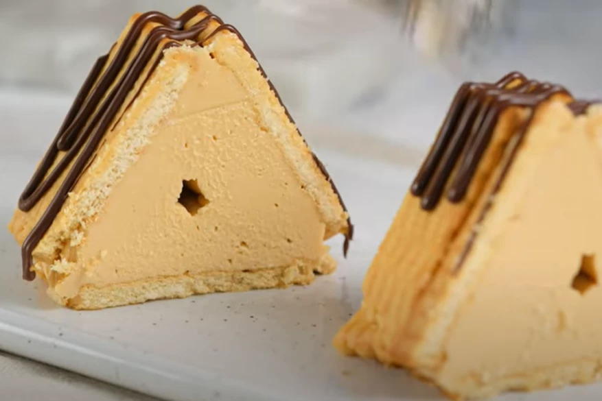 Keks malo namočite u mleko, pa ređajte na pleh obložen prijanjajućom folijom, tako bude pet redova po tri komada. Špricem nanesite fil ravnomerno preko keksa, a potom uz pomoć folije spojite keks tako da dobijete oblik piramide. Dobro zamotajte i stavite da se hladi u frižideru na dva sata.