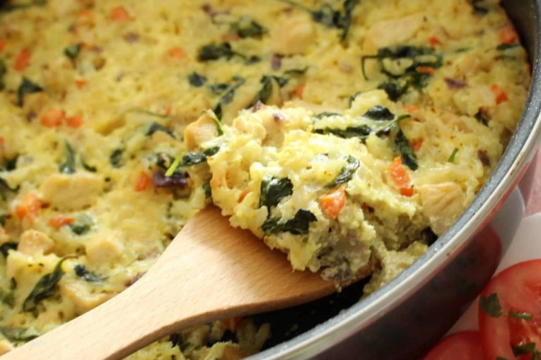 3. Ubacite skuvan pirinač, spanać, prelijte pavlakom za kuvanje i začinite, promešajte, preručite u vatrostalnu posudu ili pleh i stavite u rernu na 200 stepeni 10-15min da se zapeče.