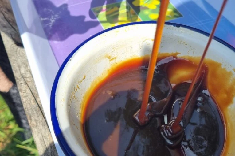 - Tučevina je izgnječeno voće koje pokupimo u burad i dobro je da ono tako prenoći a narednog jutra, što ranije počinje ceđenje. Za to koristimo tijesak, orlić i dve debele daske probušene da bi tijesak mogao da se privija po ručno iskopanim navojima. Između dve daske stavi se sitna torba napunjena tučevinom, odnosno izgnječeni voćem pa se privijajući orlić iscedi zadnja kap soka. Kad smo pri kraju ceđenja, Hajrija i ja naložimo vatru, stavimo kazan na metalno postolje koje zovemo sadžak. Kazan do vrha napunimo sokom i tada počinje varenje site. To traje pola dana i više i nije dobro da se prekida dok sita ne bude gotova - priča Murat.