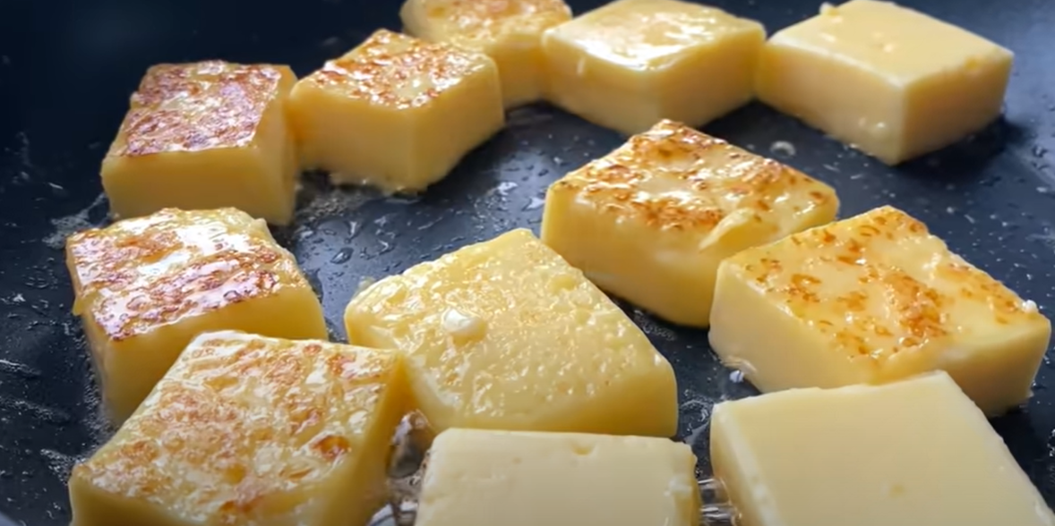 Prespite u neku plitku posudu i stavite u frižider na 2 sata. Kada se dobro ohladi isecite kocke i propržite u tiganju u kome ste prethodno zagrejali puter.